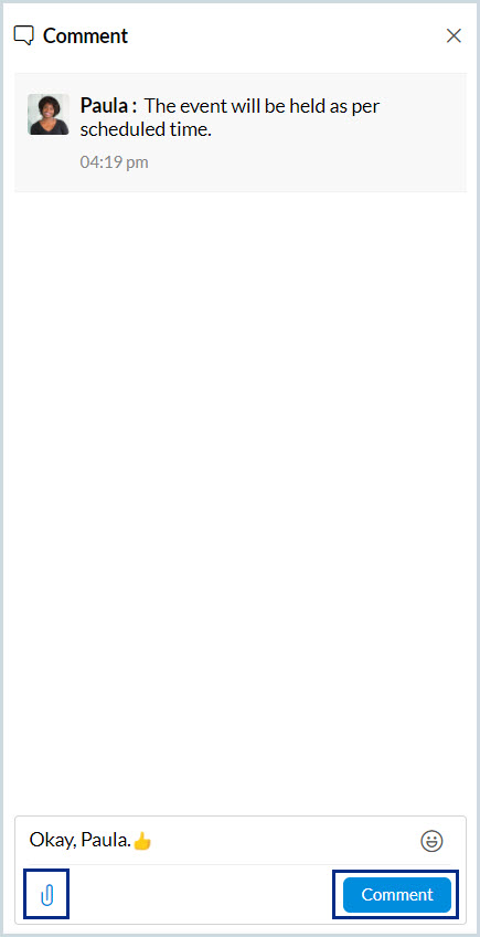 5. コメントボックスにコメントを入力し、エモジを追加します。コメントボックスの下にある添付ファイルアイコンをクリックして、自分のコンピュータから添付ファイルを追加します。