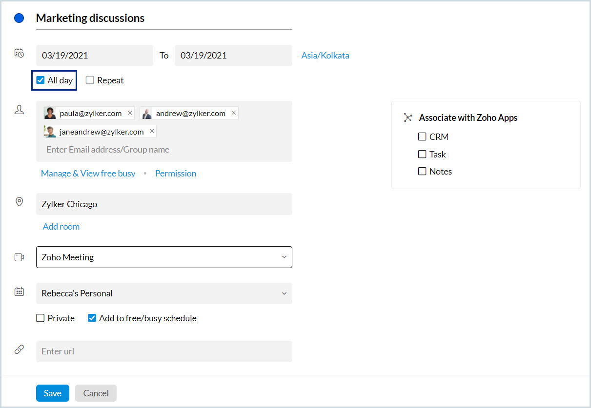 一日中続くイベントを主催する場合、できることを一日中のイベントとしてZohoカレンダーで設定し、利用可能なステータスを更新します。