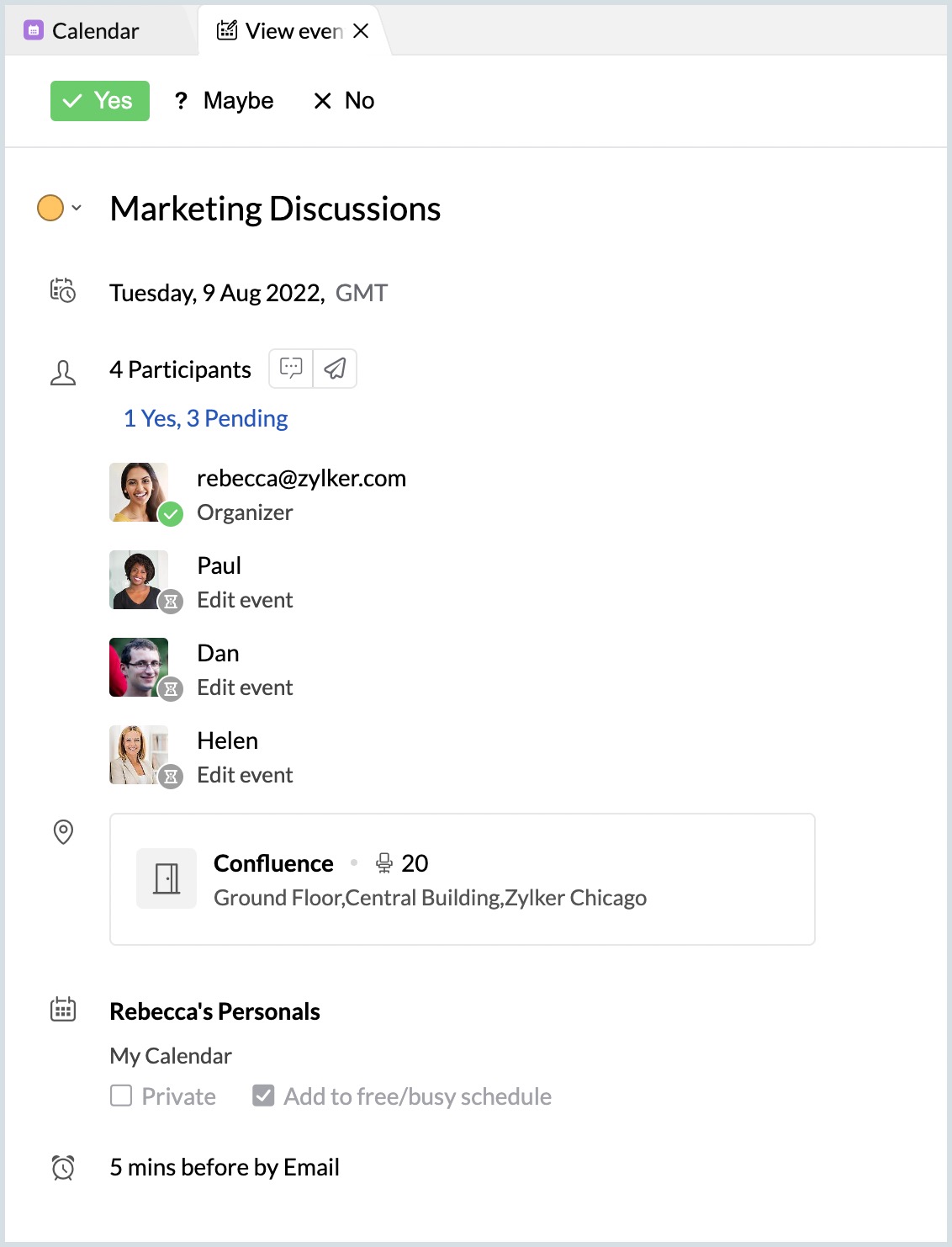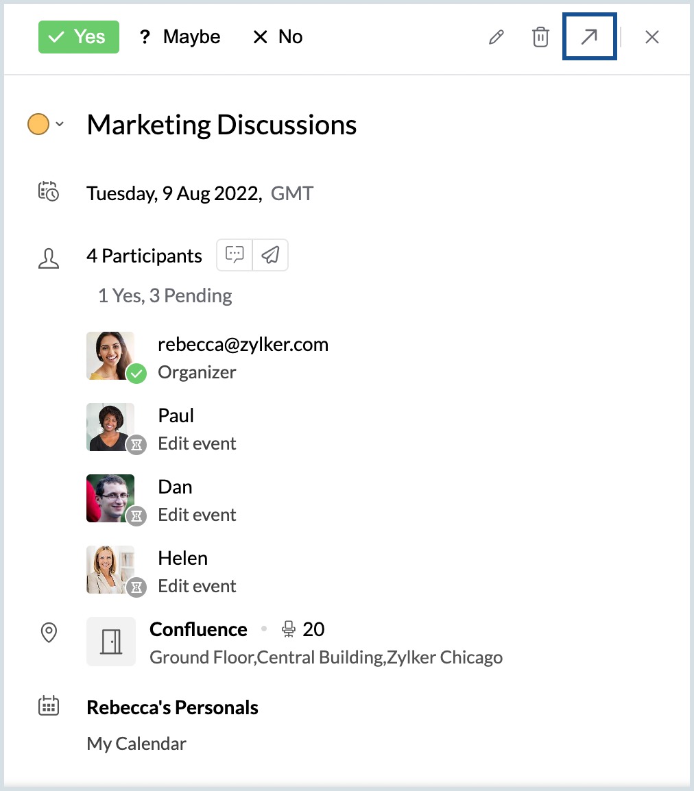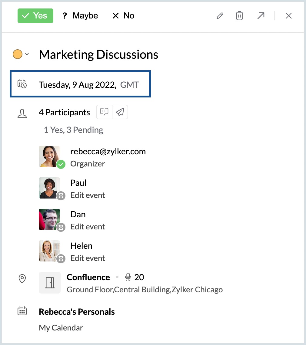 イベントの詳細を表示したり、編集、削除、印刷、チャットを使用してイベントについて話すことができます。これらの設定は、イベント表示タブで提供されます。