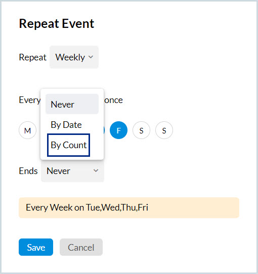 8. イベントが終了する 終了日 または回数を選択します、あるいはイベントが継続中の場合は なし を選択します。繰り返しイベントの詳細が繰り返しイベントポップアップの下部に表示されます。