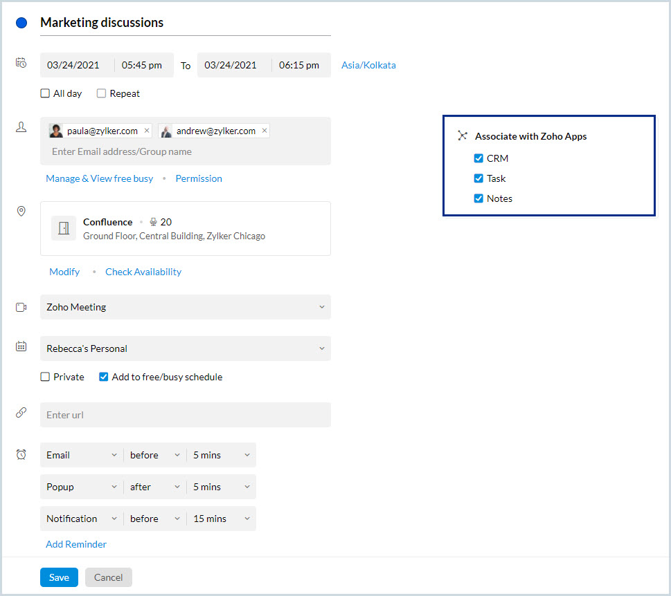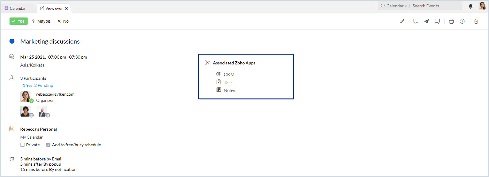 イベントの詳細は選択したZohoアプリに関連付けられます。イベントの招待やイベントの更新メールが参加者のメールアドレスに送信されます。