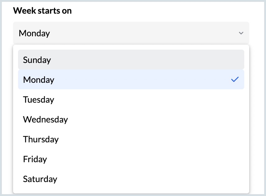週の開始日: これは、カレンダーに表示される週/月の開始日を示します。異なる地域で異なる伝統があるため、表示をそれに応じてカスタマイズできます。