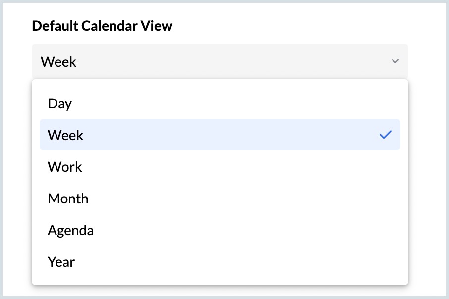 Zoho Calendarのデフォルト表示オプションを使用すると、カレンダー表示を好みに応じて設定できます。Zoho Calendarにログインするたびに、デフォルト表示が表示されます。日、週、仕事、月、アジェンダ、または年間表示から選択することができます。
