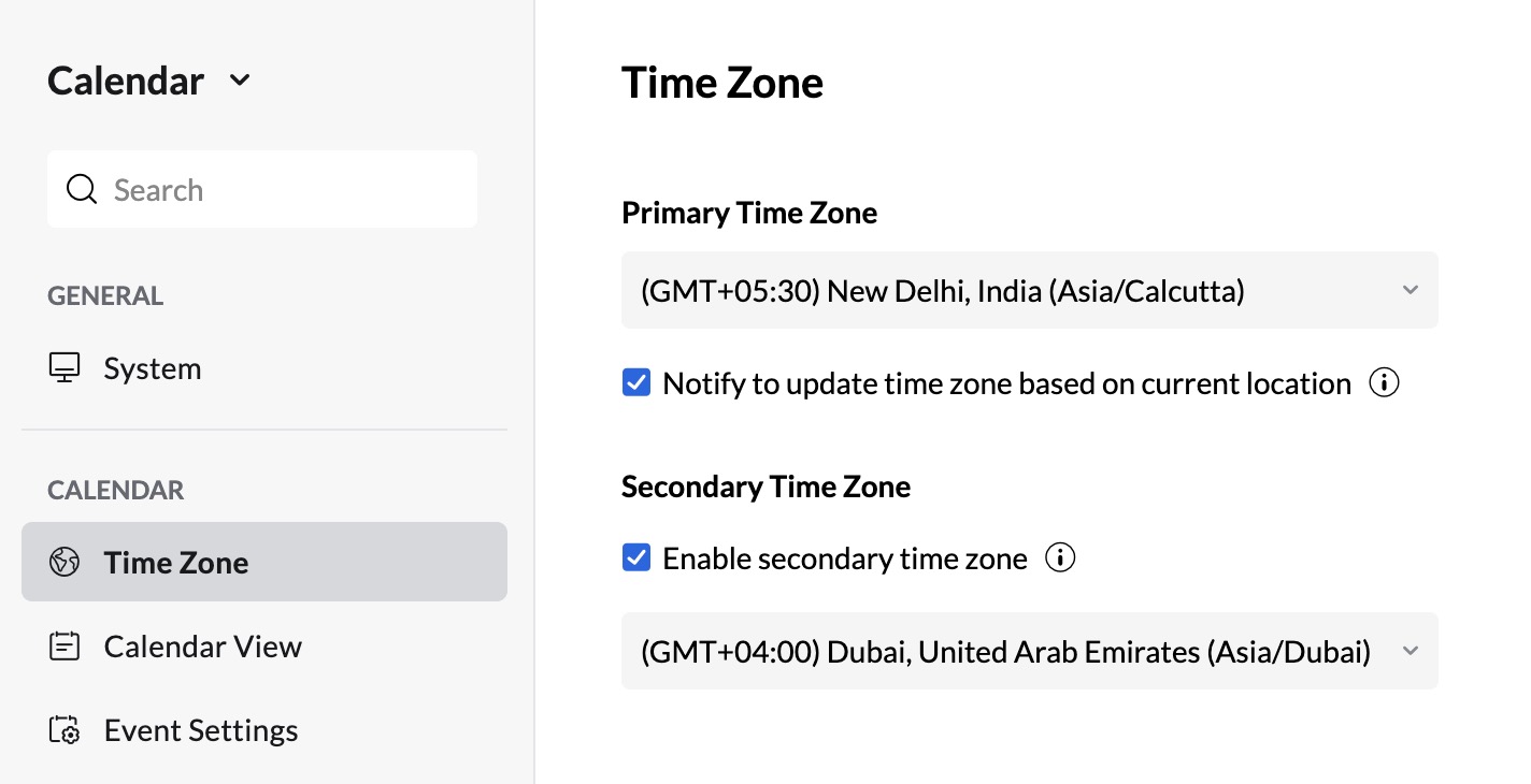 Zoho Calendarのタイムゾーンは、あなたのZoho アカウントの場所に基づいて初期設定されます。イベント通知は設定タイムゾーンに基づいて受信されます。もしあなたがイベントの時間の不一致に気づいた場合、カレンダーで指定されたタイムゾーンを確認し、必要に応じて修正してください。また、あなたの勤務地に応じてタイムゾーンを変更し、予定を作成することもできます。