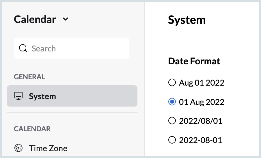 1. Zoho Calendarにログインし、設定> 一般> Systemに移動します。