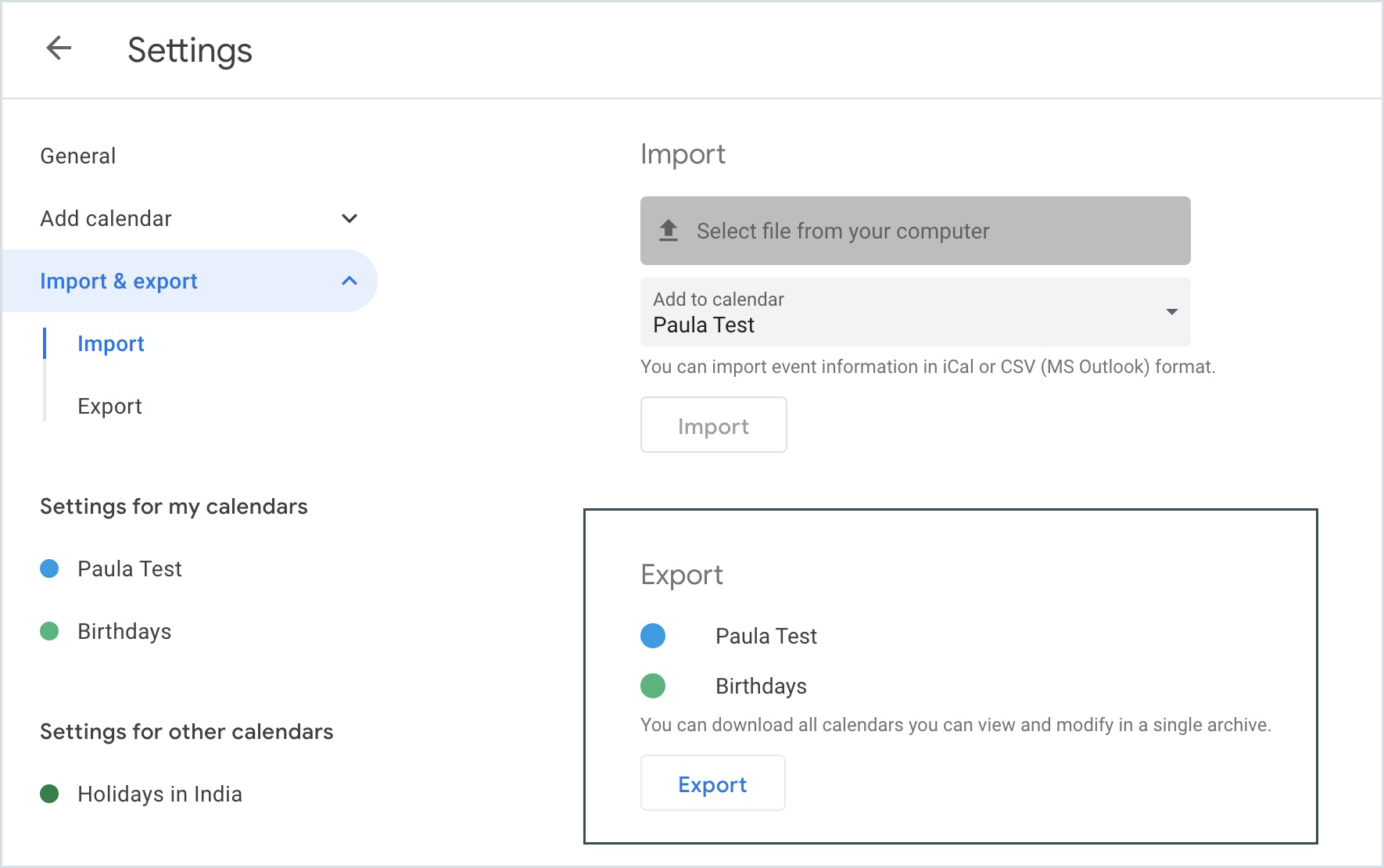 5. エクスポートをクリックしてファイルをダウンロードします。ダウンロードされたファイルは.zipファイルになります。このファイルを解凍すると、連絡先用の1つとカレンダー用のもう1つの2つのICSファイルが見つかります。