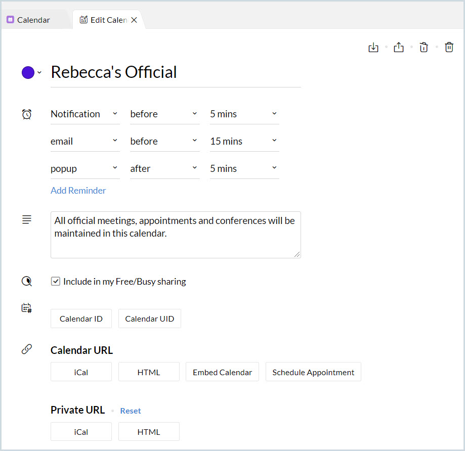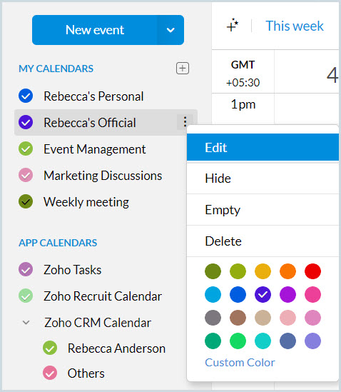 Zoho Calendarでは、いつでも既存のカレンダーを修正する柔軟性があります。編集オプションを使用してカレンダー名を変更したり、異なるテーマを選択したり、カレンダーにメモを追加したりすることができます。