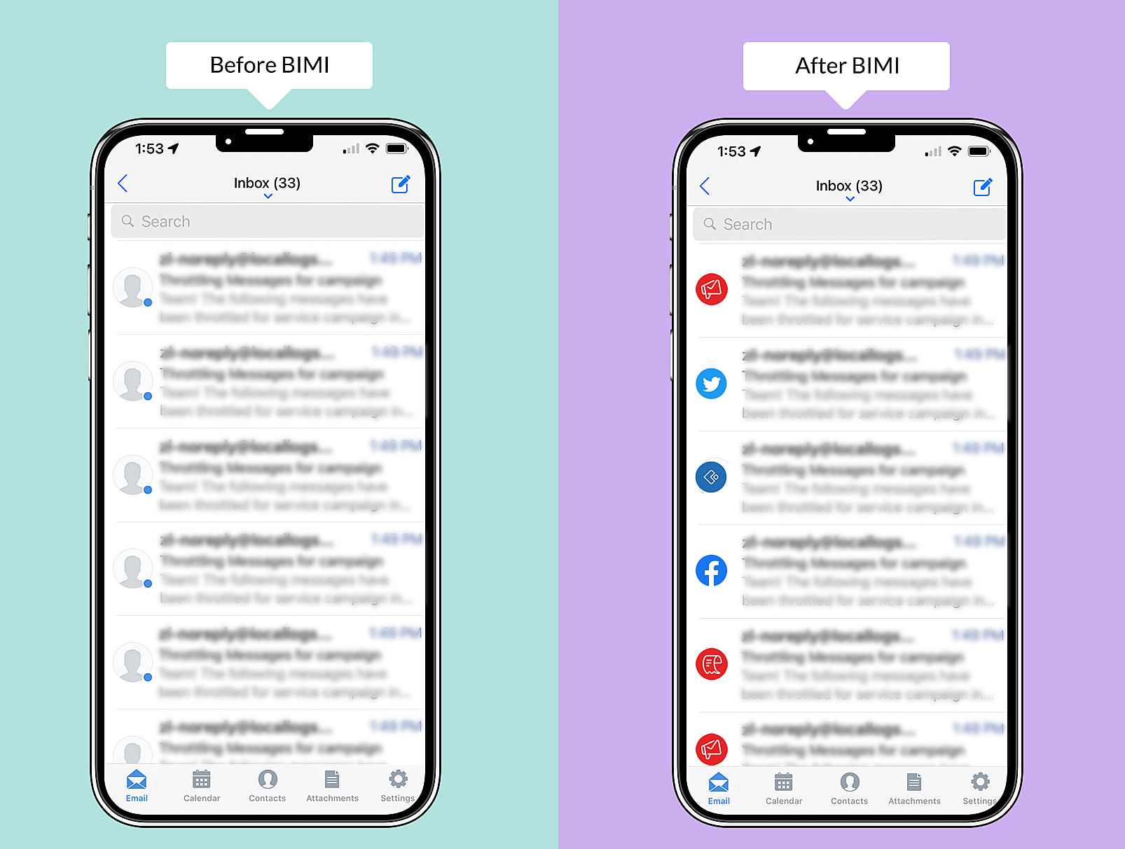 たとえば、BIMIを利用して配信したメールは、受信者の受信トレイで以下のように表示されます(左:BIMIによる認証なし、右:BIMIによる認証あり)。