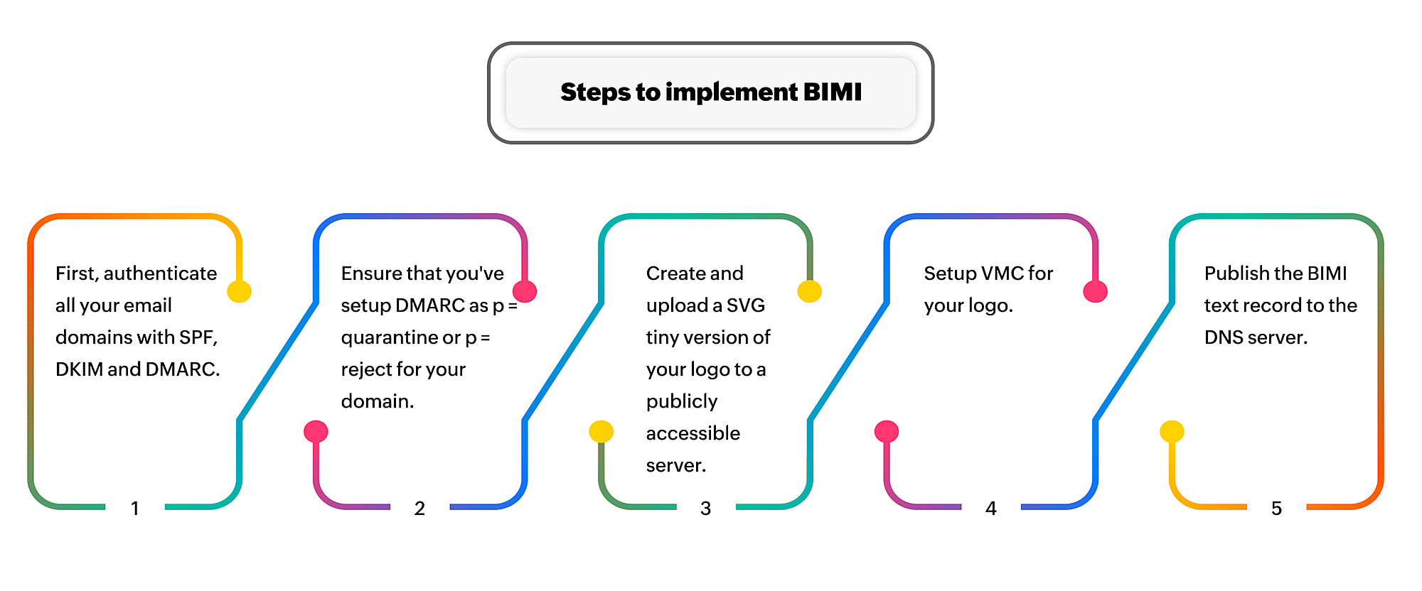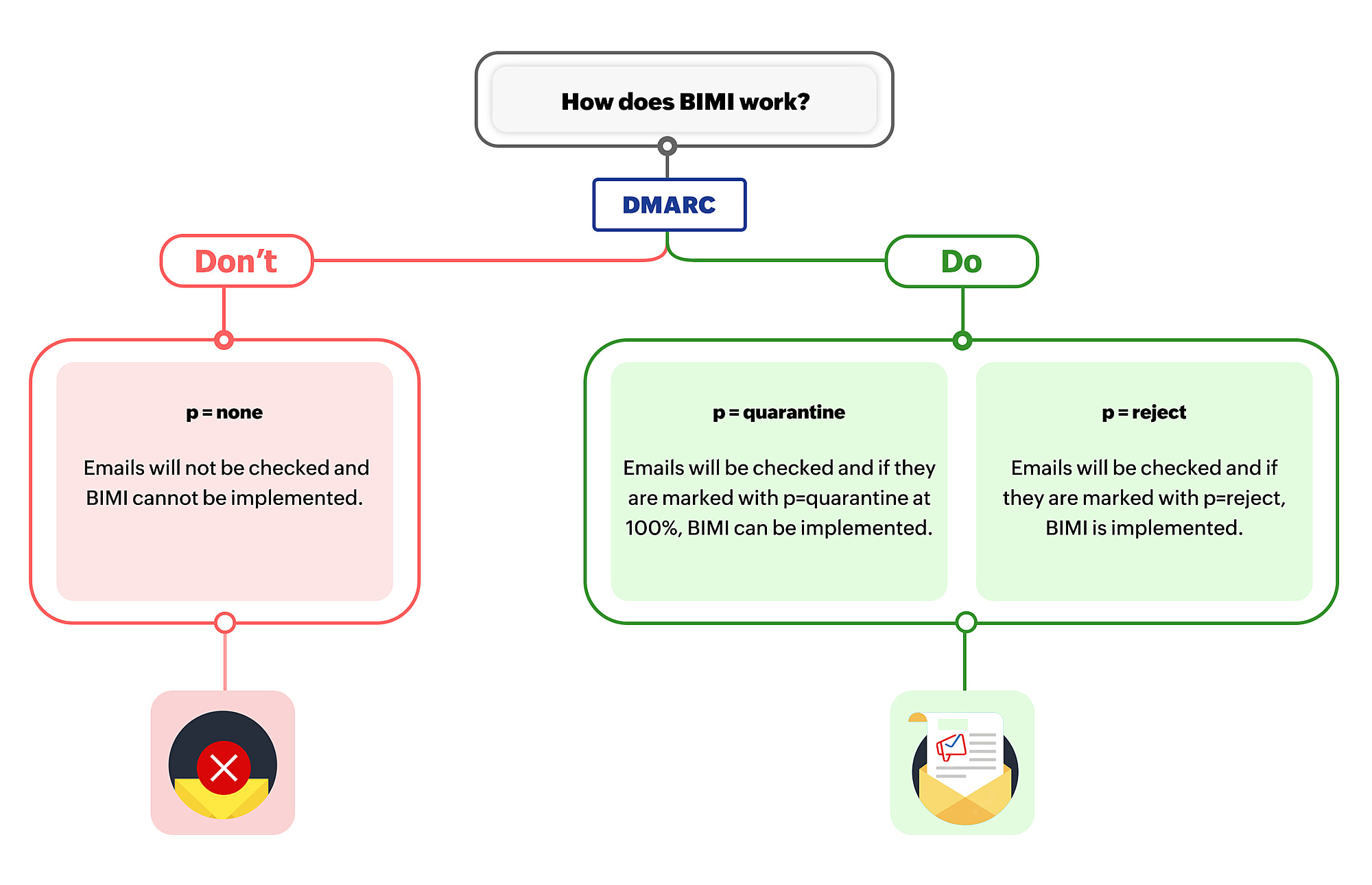 BIMIでは、メールの配信元を認証する方法としてDMARCが使用されます。DMARCの設定では最も厳格なポリシーを採用することが推奨されます。そのことにより、配信元が本当に信頼できる場合にのみ、組織やブランドのロゴを表示させることができます。DMARCについての詳細