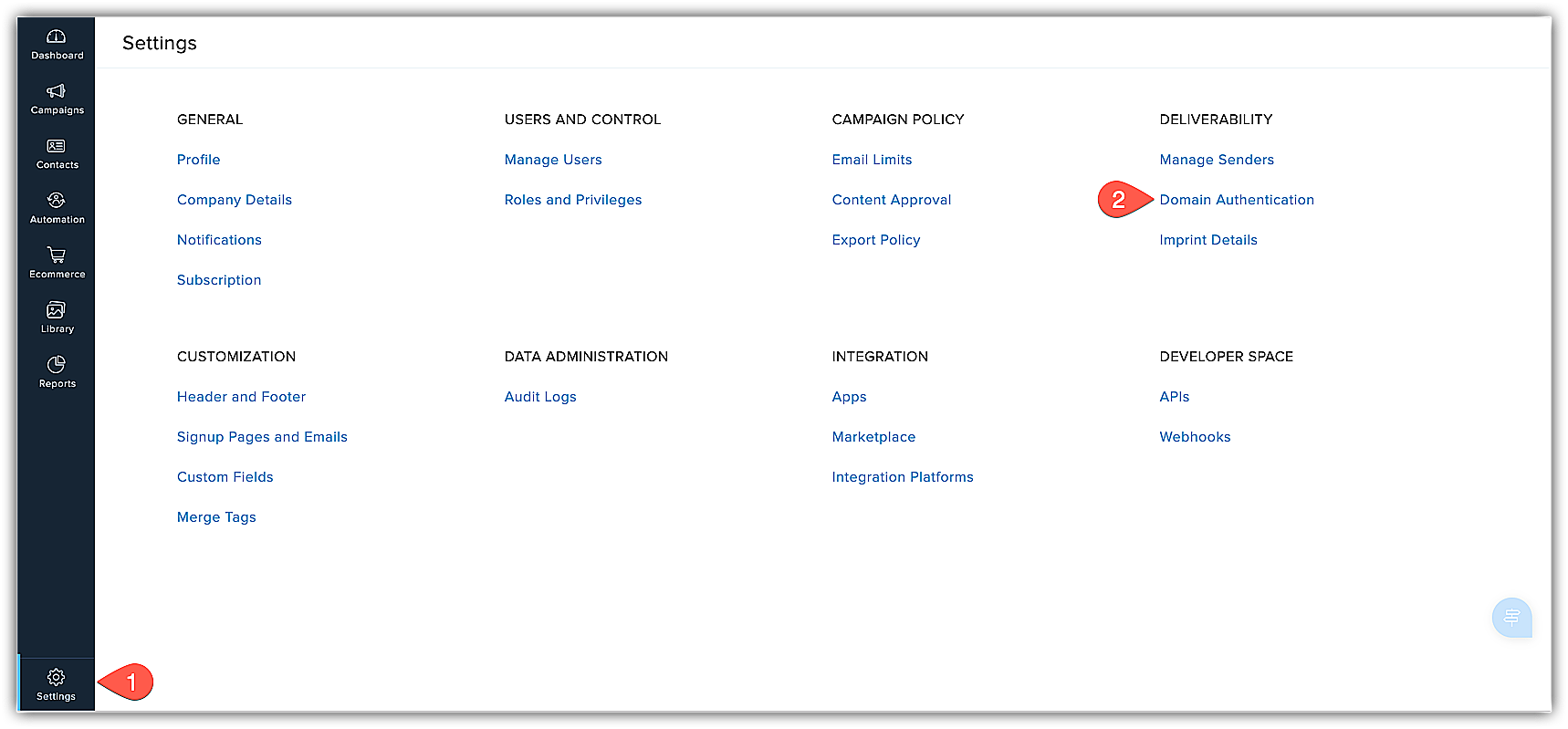 - [配信設定]の下の[ドメイン認証]を選択します。