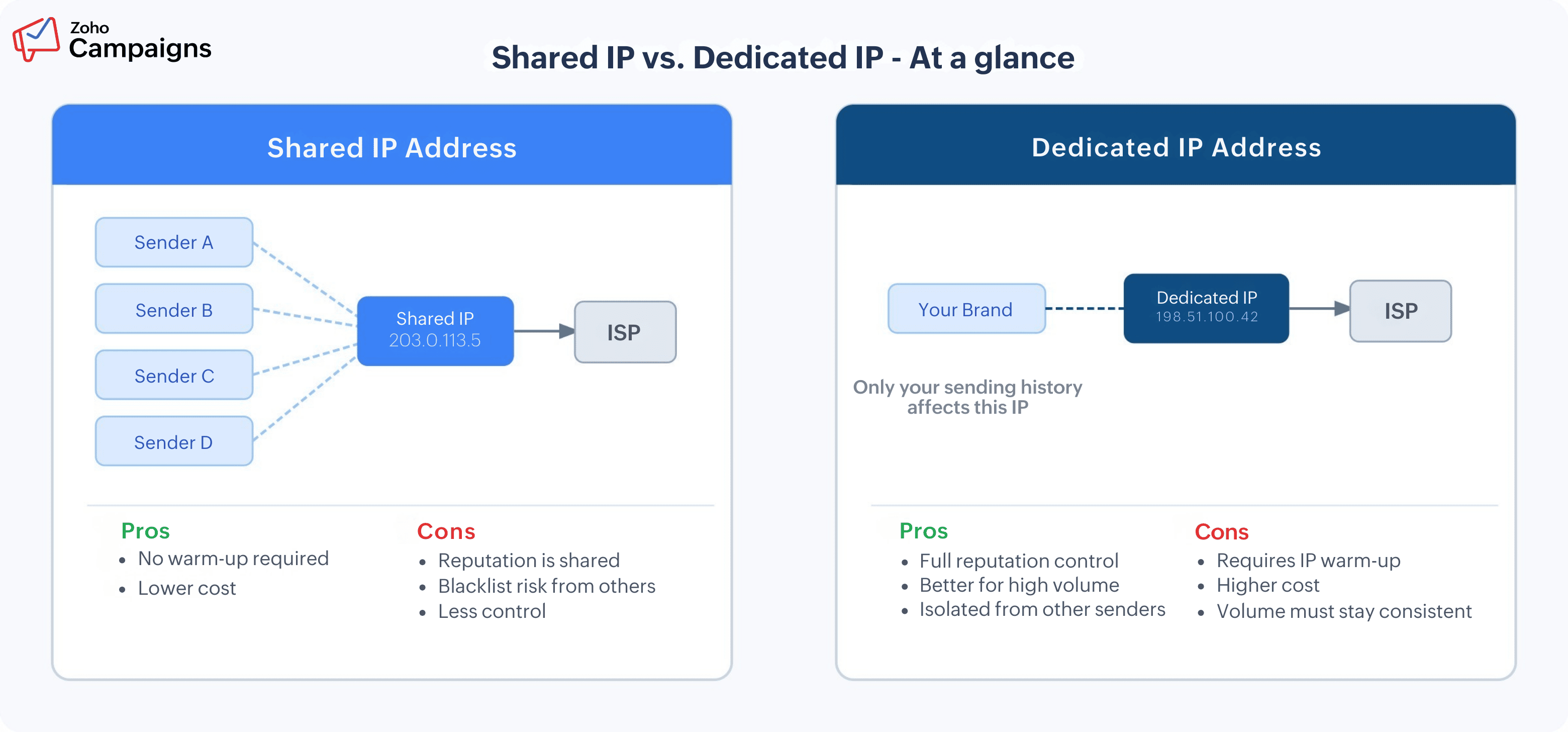 責任はすべて自分の組織にある:配信リストの管理が不十分であったり、迷惑メール率が高かったり、反応率の低い登録者にメールを一括配信したりすると、IPアドレスの信頼性が低下します。共有IPプールのような緩衝作用がないため、直接影響を受けます。