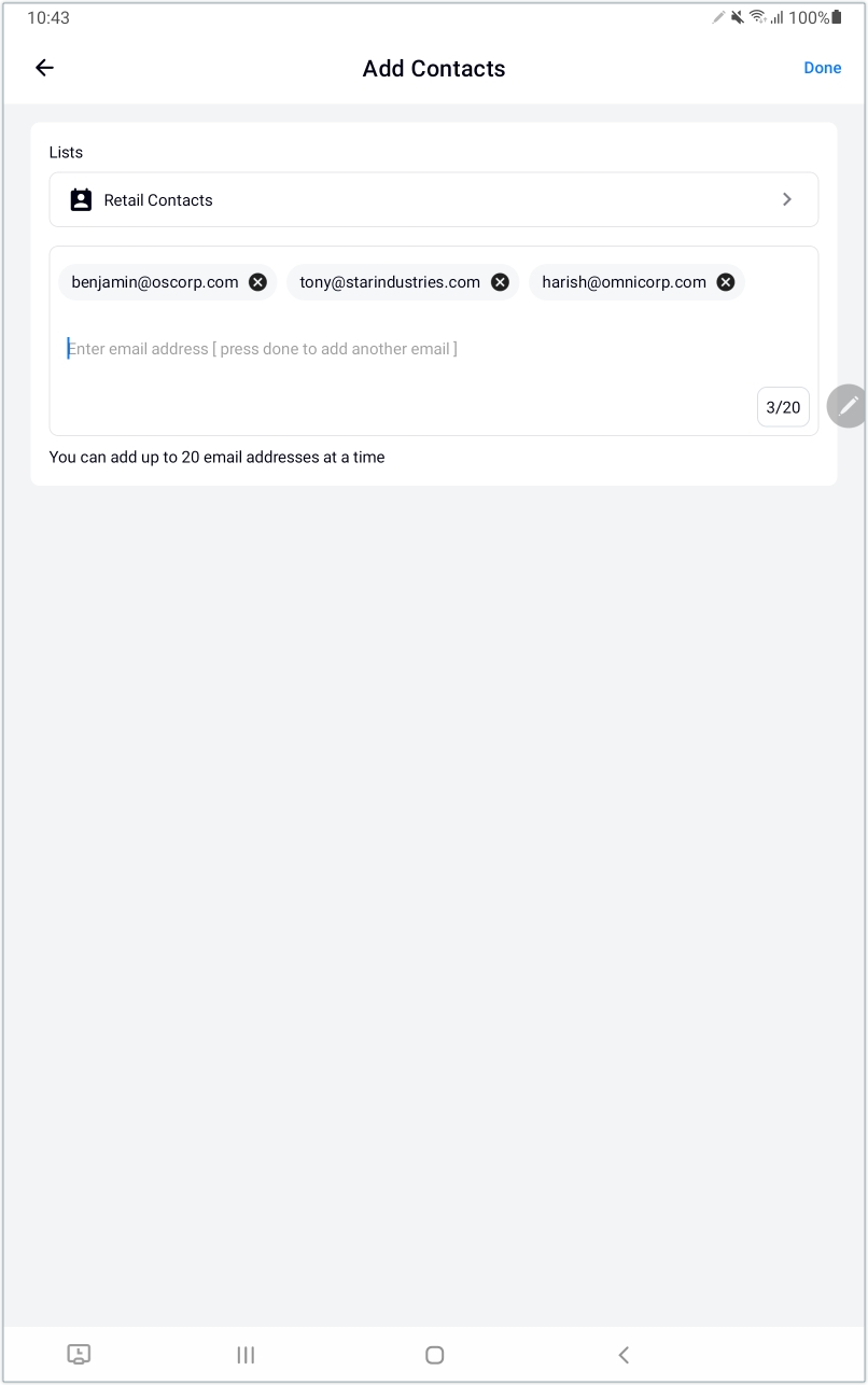 Zoho Campaignsのモバイルアプリを使用すると、ファイルのインポートにより、連絡先を配信リストに追加できます。対応しているファイル形式は、.csv、.xls、.xlsxです。必要な手順は、連絡先をインポートする配信リストを選択し、各データ項目の関連付けを設定して、ファイルをインポートするだけです。複数の連絡先を一度にインポートできます。