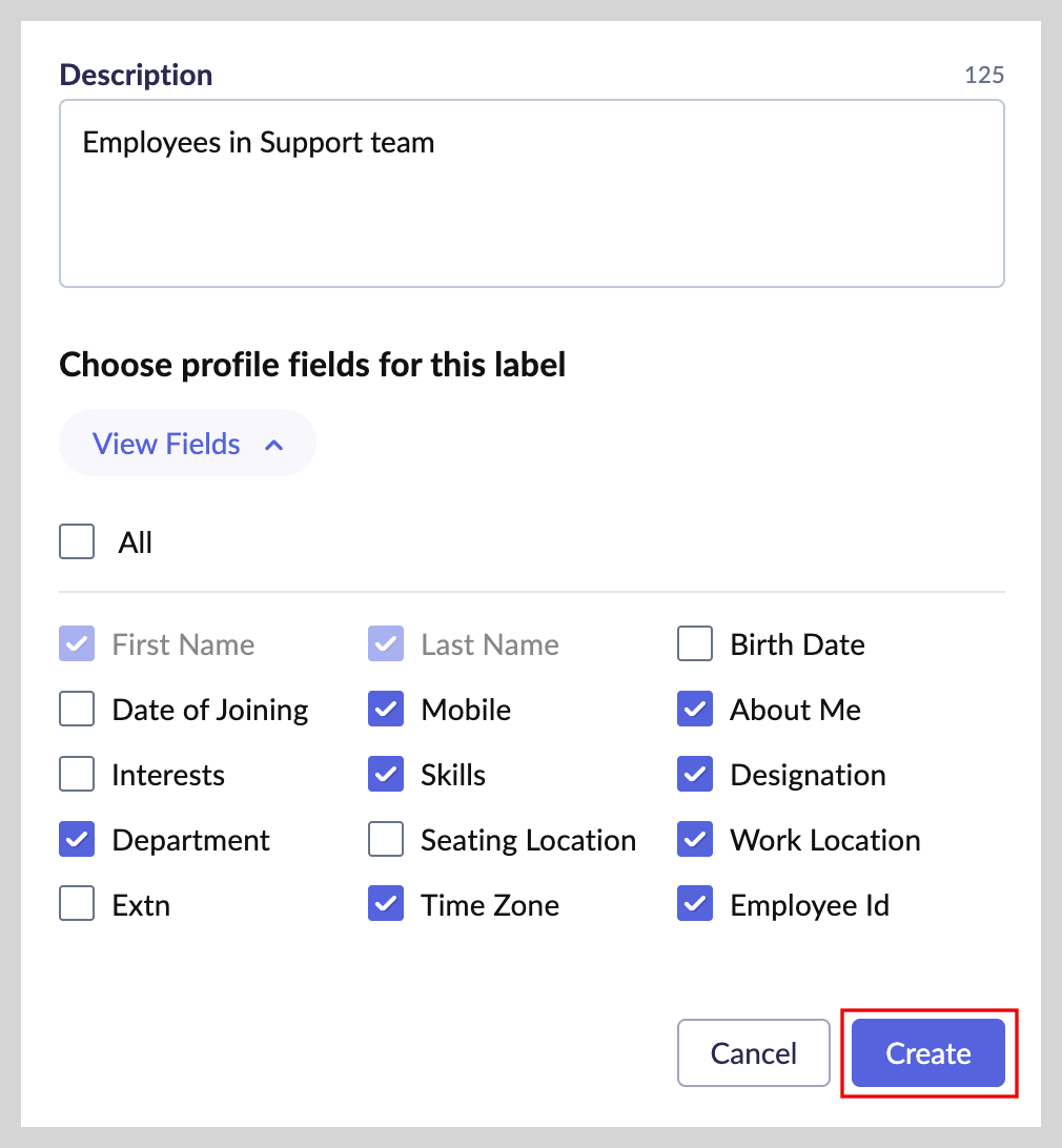 説明を入力し、このプロフィールラベルで表示するプロフィール項目を選択します。