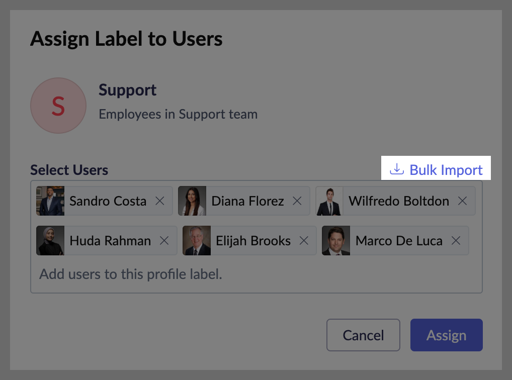 ラベル割り当て用のポップアップで、右側の[一括インポート]をクリックします。