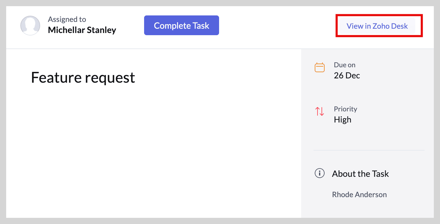 任意のタスクをクリックし、Desk で表示を選択すると、Zoho Desk で直接開くことができます。