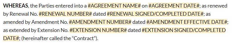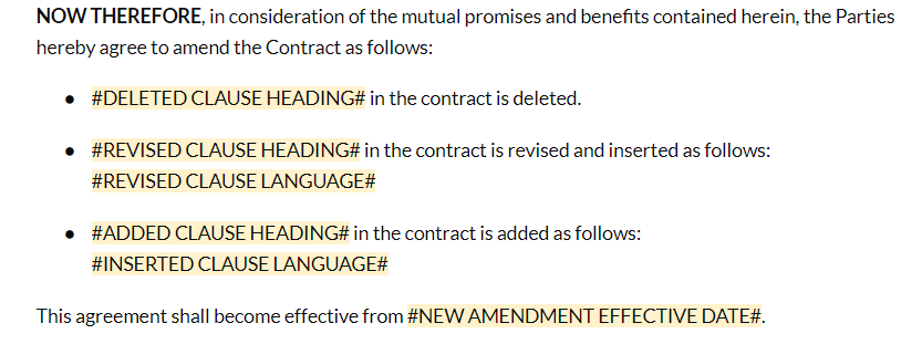 テンプレートの「条項」は、読者に合意に必要なコンテキストを提供するように設計されています。契約を修正、更新、または延長すると、「条項」は自動的にすべての過去の修正、更新、拡張の履歴とともに元の契約の内容をデータ化します。