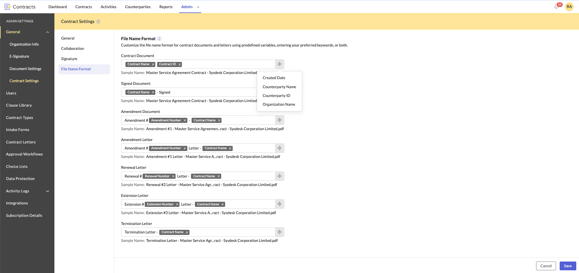 4. をクリックして定義済み変数を追加するか、標準キーワードを入力するか、または両方を組み合わせて、契約書類とレターのファイル名形式を定義します。