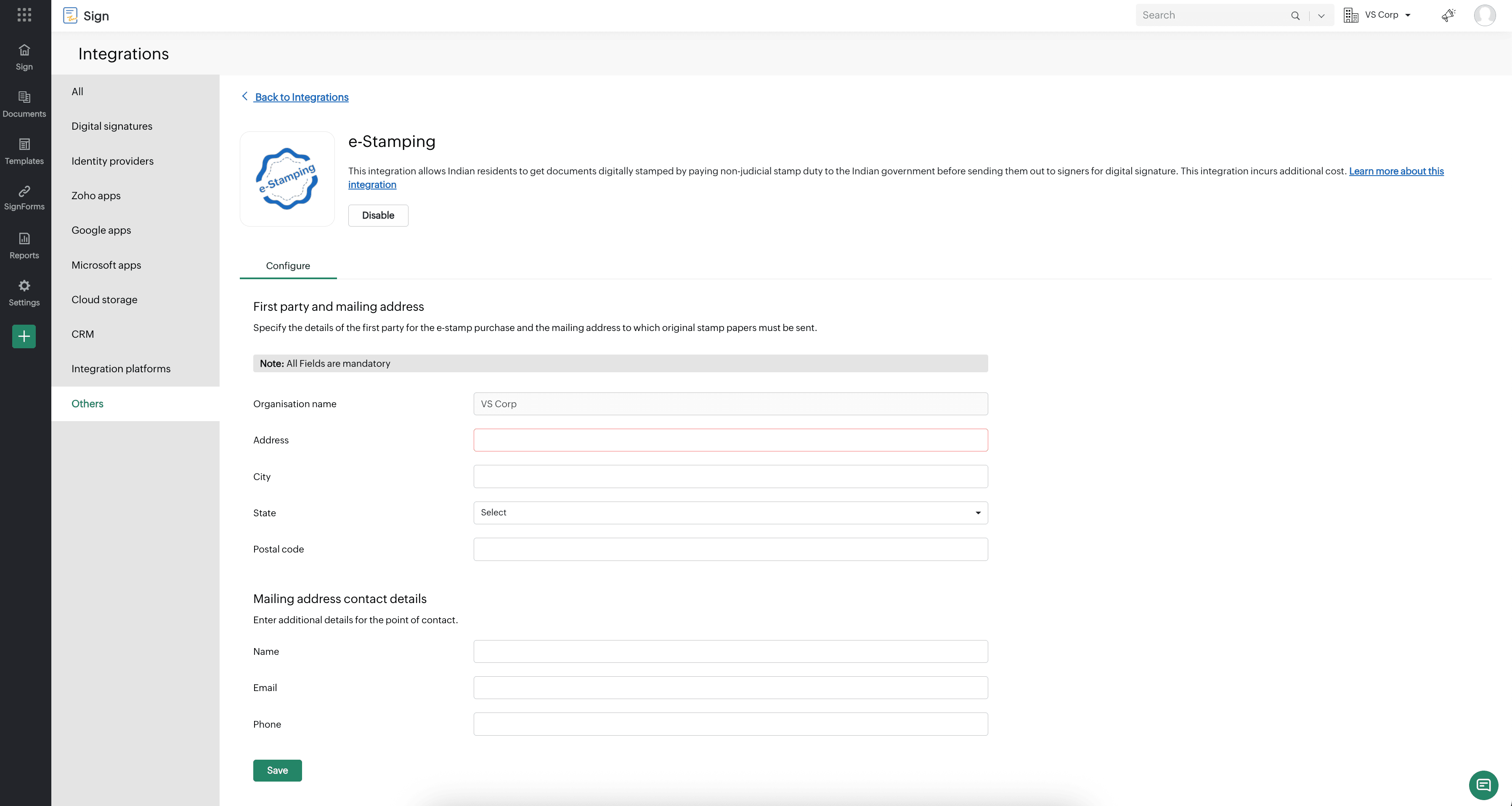5. Zoho SignのIntegrationsページでその他をクリックし、e-Stamping連携の設定するをクリックします。