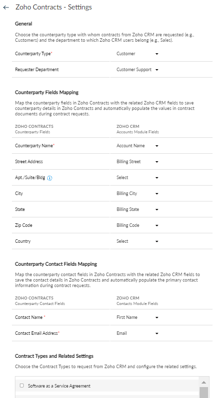 選択された契約種類の項目値がマッピングされていないものは、要求された契約中にブランクのまま残されます。これらの値は、Zoho契約で後から入力することができます。