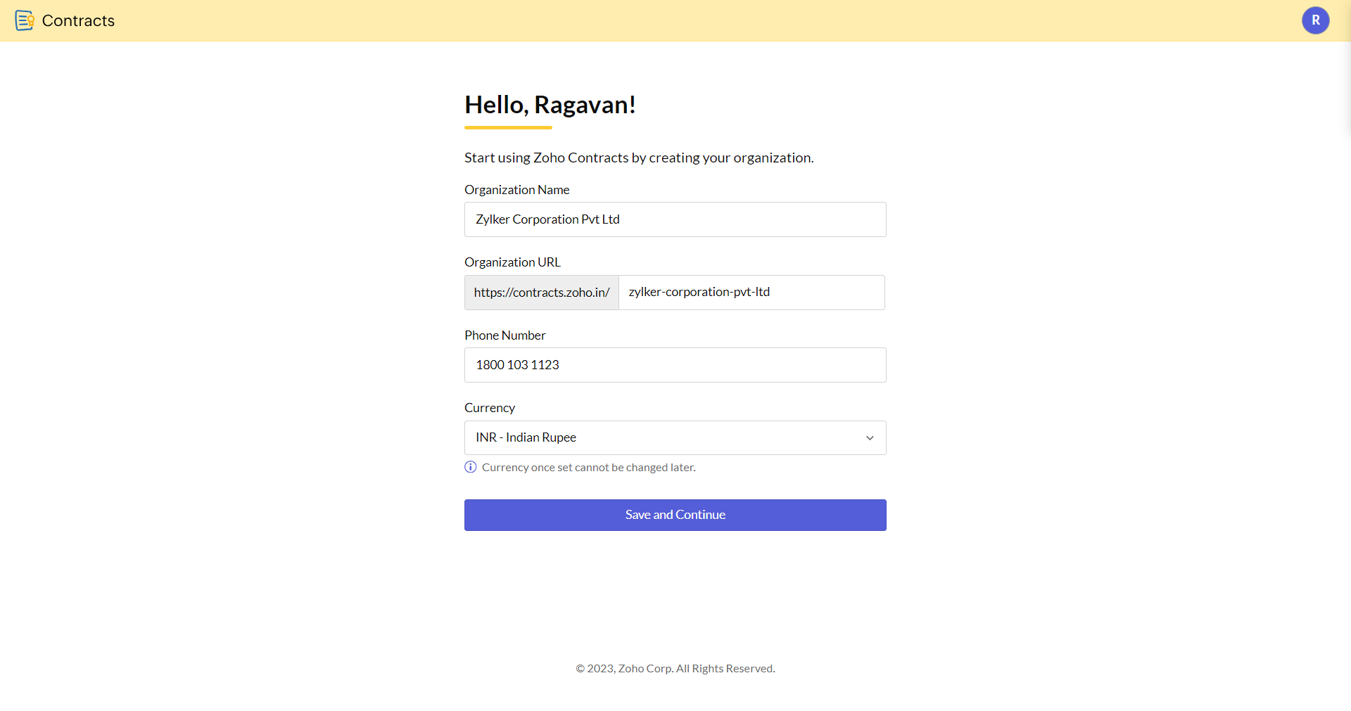 組織とは、あなたが所有するか、勤務する組織のために作成したZoho Contractsアカウントを指します。組織を作成することは、組織のZoho Contractsアカウントを管理し、Zoho Contractsを使用する組織のユーザーを追加するために必要です。
