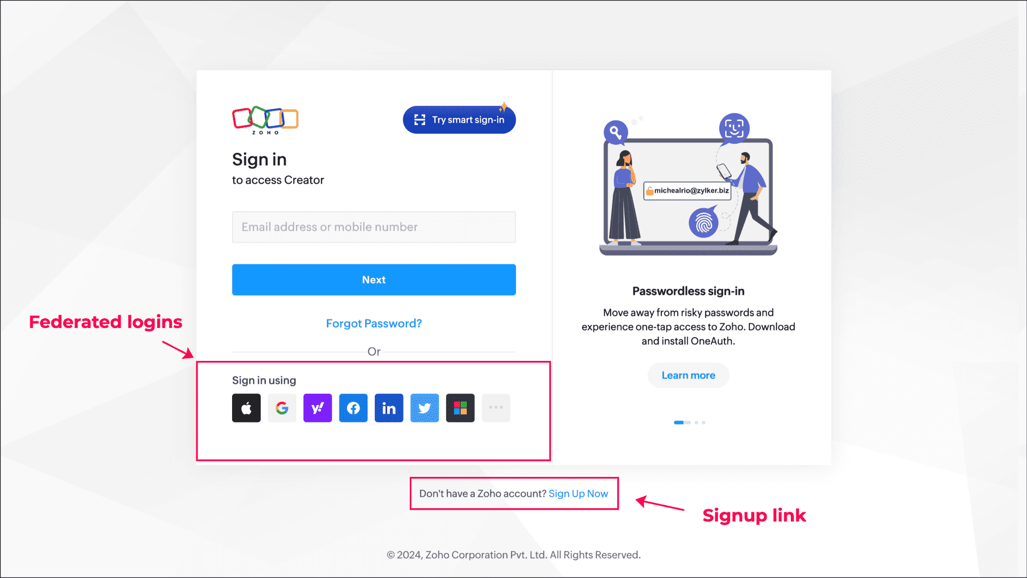 「いいえ」を選択した場合、他のサインインする設定は表示されません。Zoho ユーザーのみサインインすることができます。