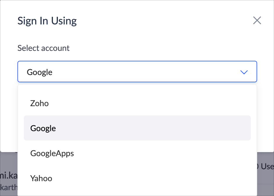 「Zoho」以外のオプションが選択されている場合、該当サービスのサインインページが表示されます。サインインが成功すると、ユーザーは自分のアカウントのホームページへリダイレクトされます。例として、サインインオプションでGoogleが選択された場合、アプリケーションURLにアクセスするとGoogleのサインインページが表示されます。ユーザーがGoogleの認証情報でサインインすると、必須アプリケーションにリダイレクトされます。