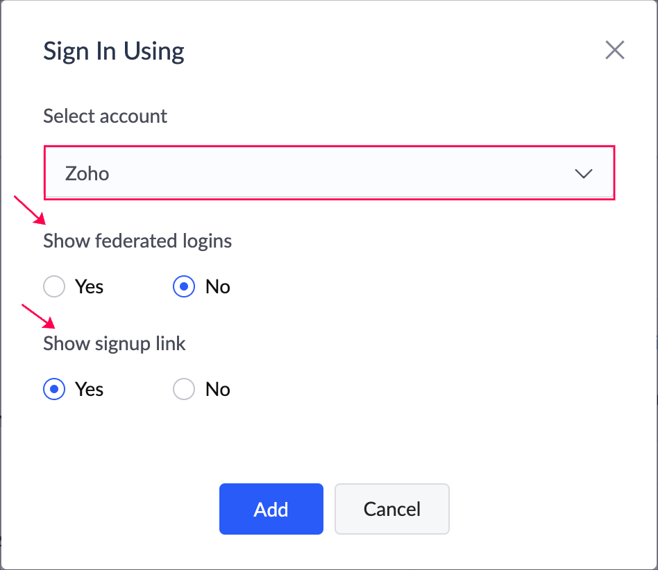 Zoho が選択された場合、federated logins の許可や新規登録の可否を選択できます。
