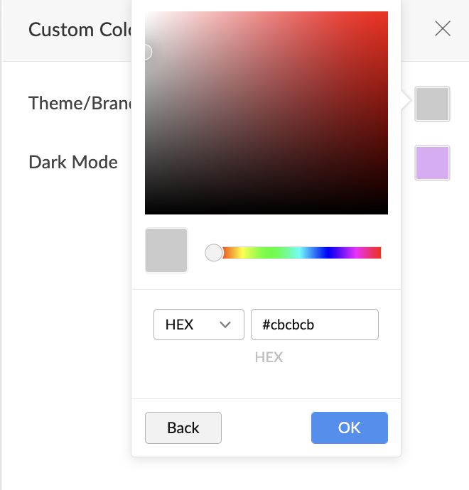 6. カラーピッカーアイコンをクリックして、 テーマ/ブランドカラー からカラーを選択するか、 さらにカラー をクリックしてカラーパレットからカスタムカラーを選択し、 OK をクリックします。カラーは カスタム タブに追加されます。