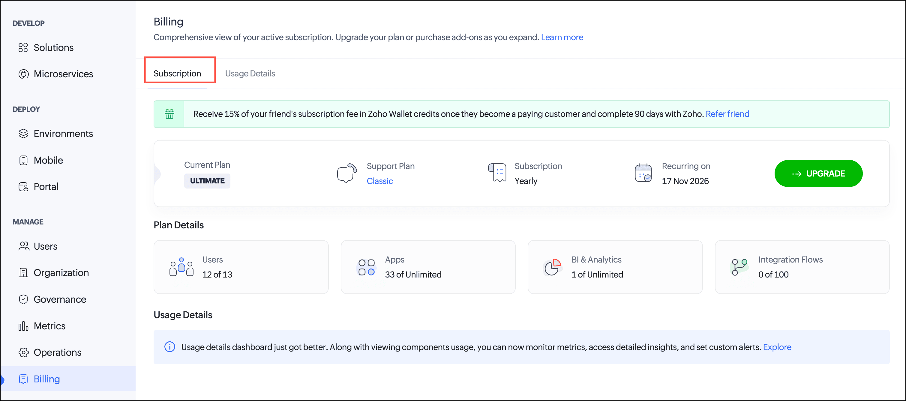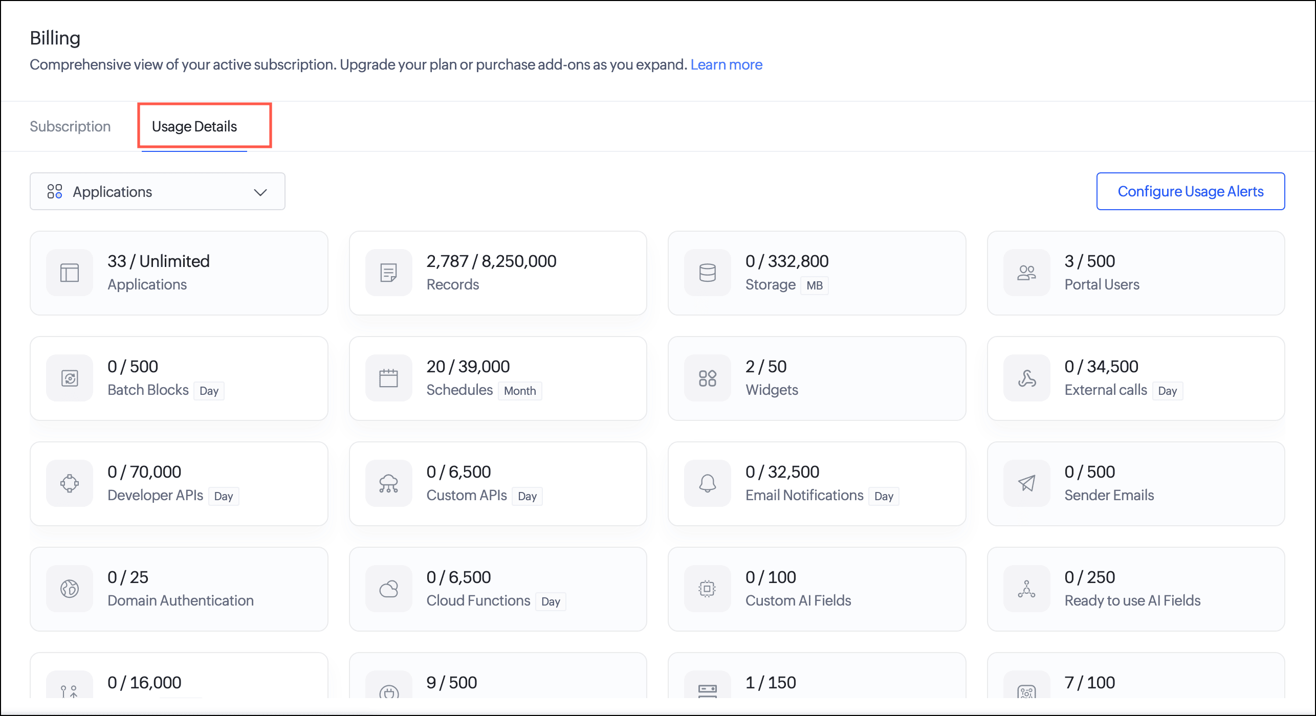 メインの Billing セクションで データ をクリックすると、指標や利用状況のインサイトを含む詳細ビューにアクセスできます。 |