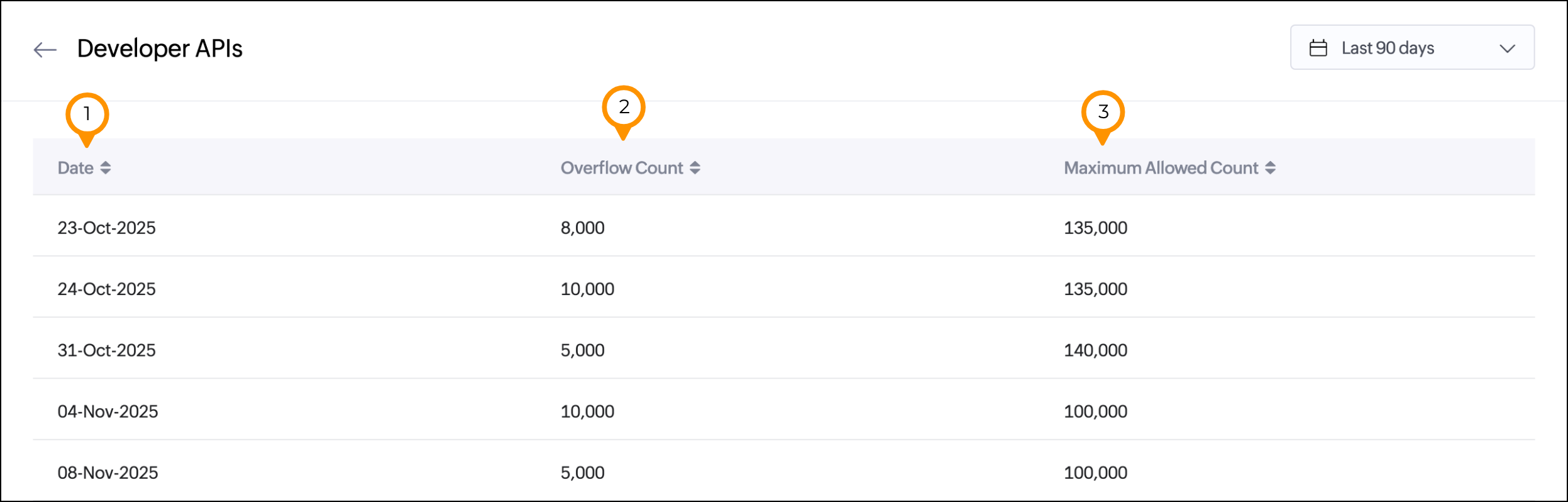 当日中にアカウントで受信した API コールの数です。Zoho アカウント内からのコールと、外部サービスからのコールの両方が含まれます。