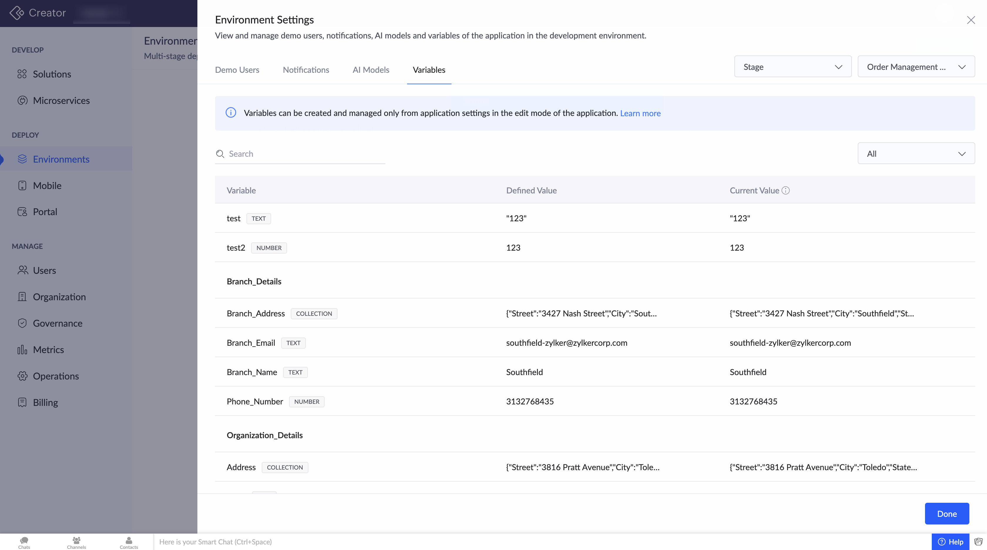 これらの設定は、Environmentsページの希望のアプリの隣にある省略記号をクリックすると表示されます。