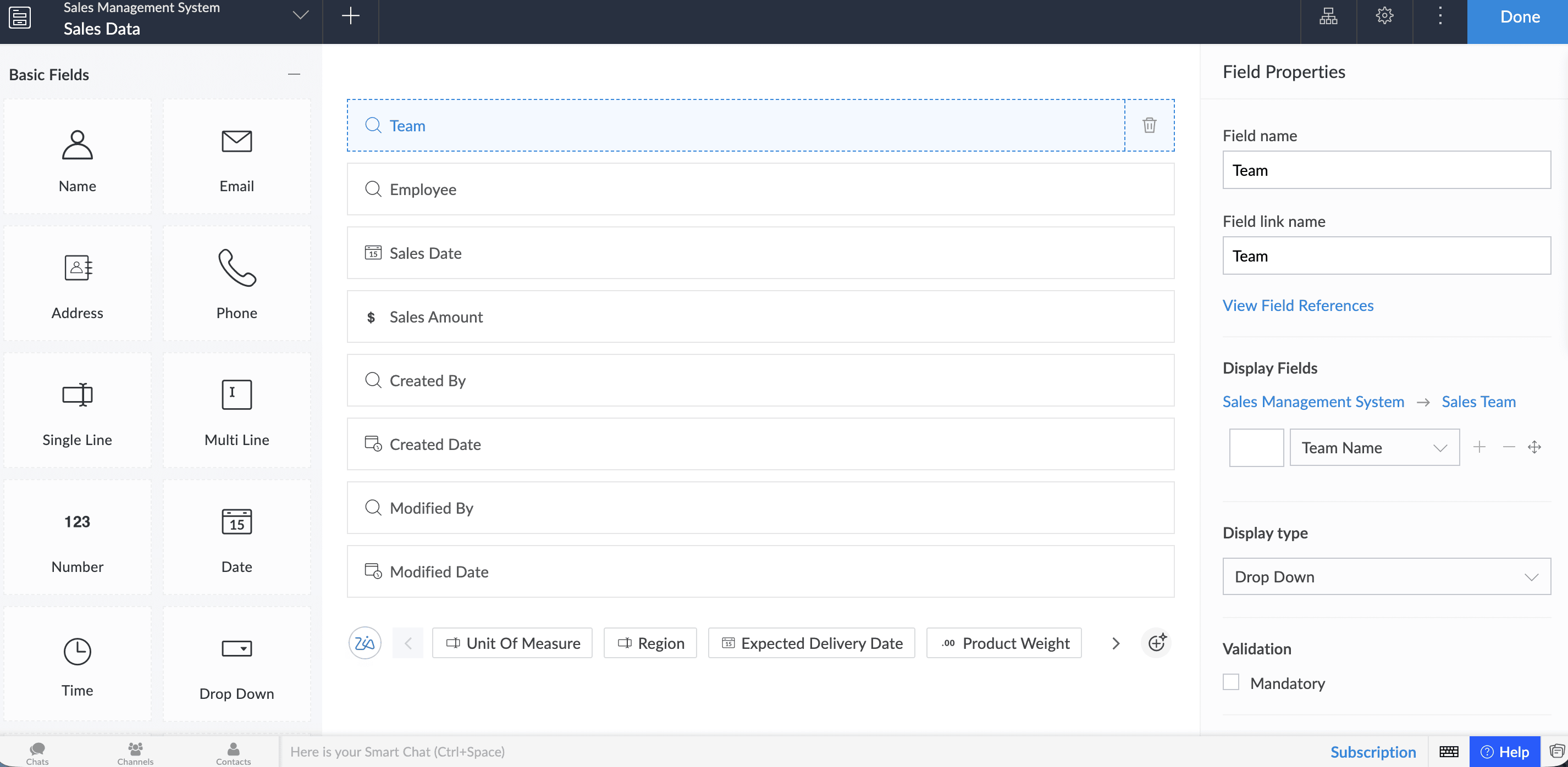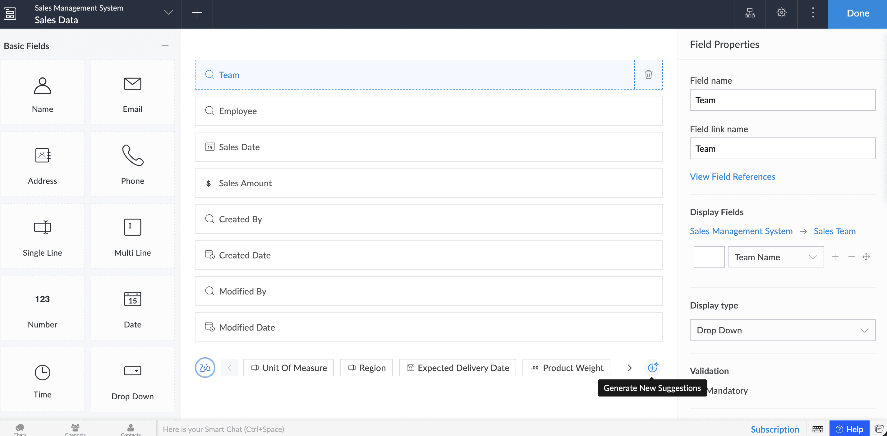 フォームビルダーでZiaアイコンをクリックすると、項目の提案を表示または非表示にできます。Ziaが関連する項目のリストを提案します。