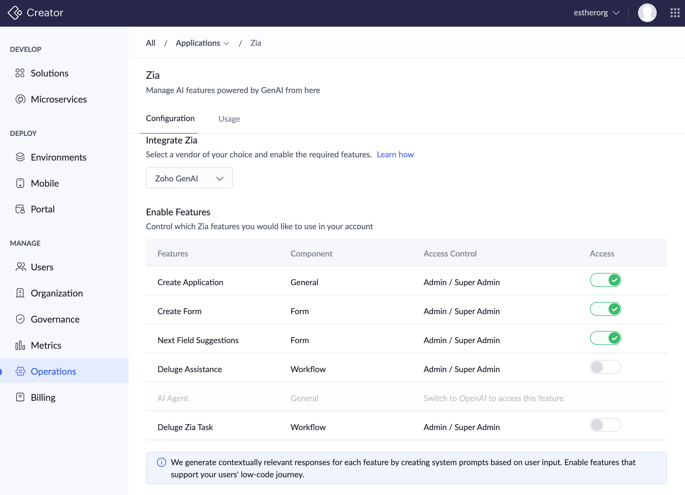 メモ: Ziaの項目提案は、Zoho GenAIがCreatorアカウントで選択されている場合のみ利用可能です。Zoho GenAIが販売者として選択され、次項目の提案が有効になっていることを確認してください。その他を参照ダブルクリックまたはドラッグ&ドロップで、リストから必要な項目を追加します。