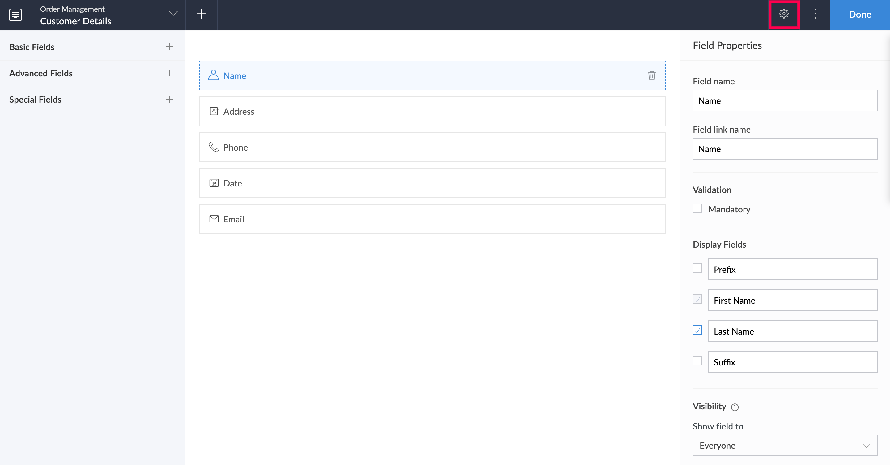 8. フォームビルダーの右上にある設定アイコンをクリックします。フォームプロパティタブが右からスライドしてきます。