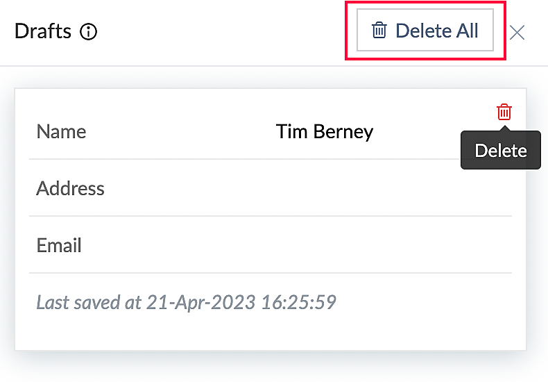 8. 下書きパネルの右上にある「すべて削除する」ボタンをクリックすると、フォームの5つの下書きをすべて削除できます。