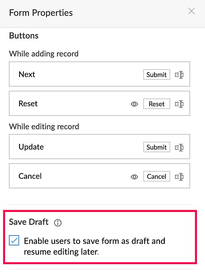 2. チェックボックスの選択を外すことで、保存 下書きオプションを無効にできます。このプロパティを無効にすると、フォームの既存の下書き(存在する場合)はすべて削除されます。