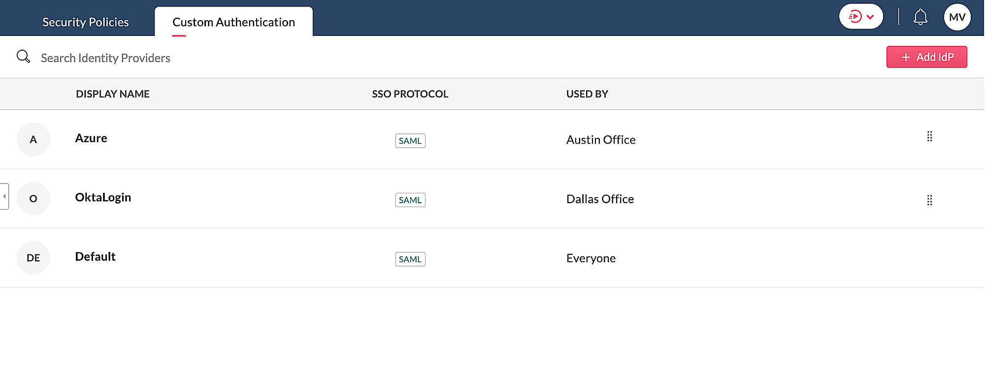 Zoho Directoryの管理パネルでは、IdPの表示が上から下への階層順で示されます。ユーザーが複数のIdPに追加されている場合、より上位にあるIdPの認証情報を使用する必要があります。優先度リストは、IdPをドラッグ&ドロップで上下に移動するだけで変更できます。