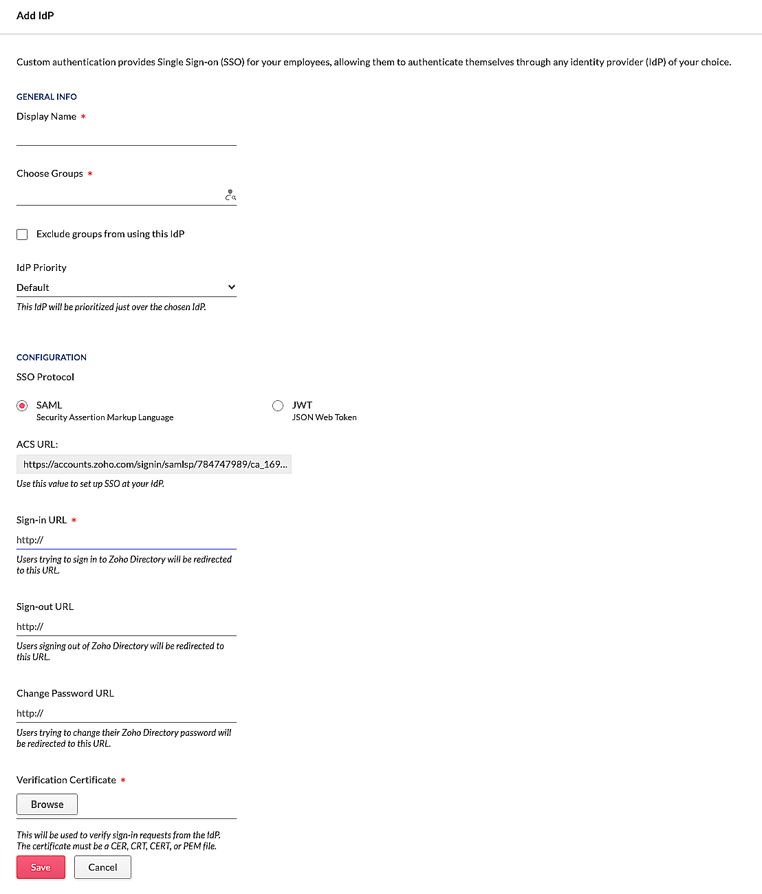 - IdPの追加 - Zoho DirectoryへIdPを追加し、カスタム認証を実現するための手順です。
