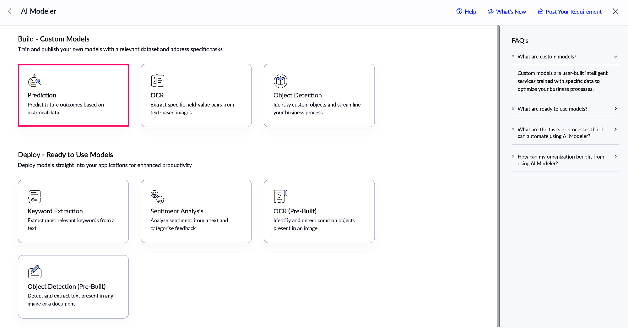 Predictionモデルは、過去データのさまざまなパターンを分析して、今後の処理や結果を予測します。詳細はPredictionモデルについてページをご参照ください。