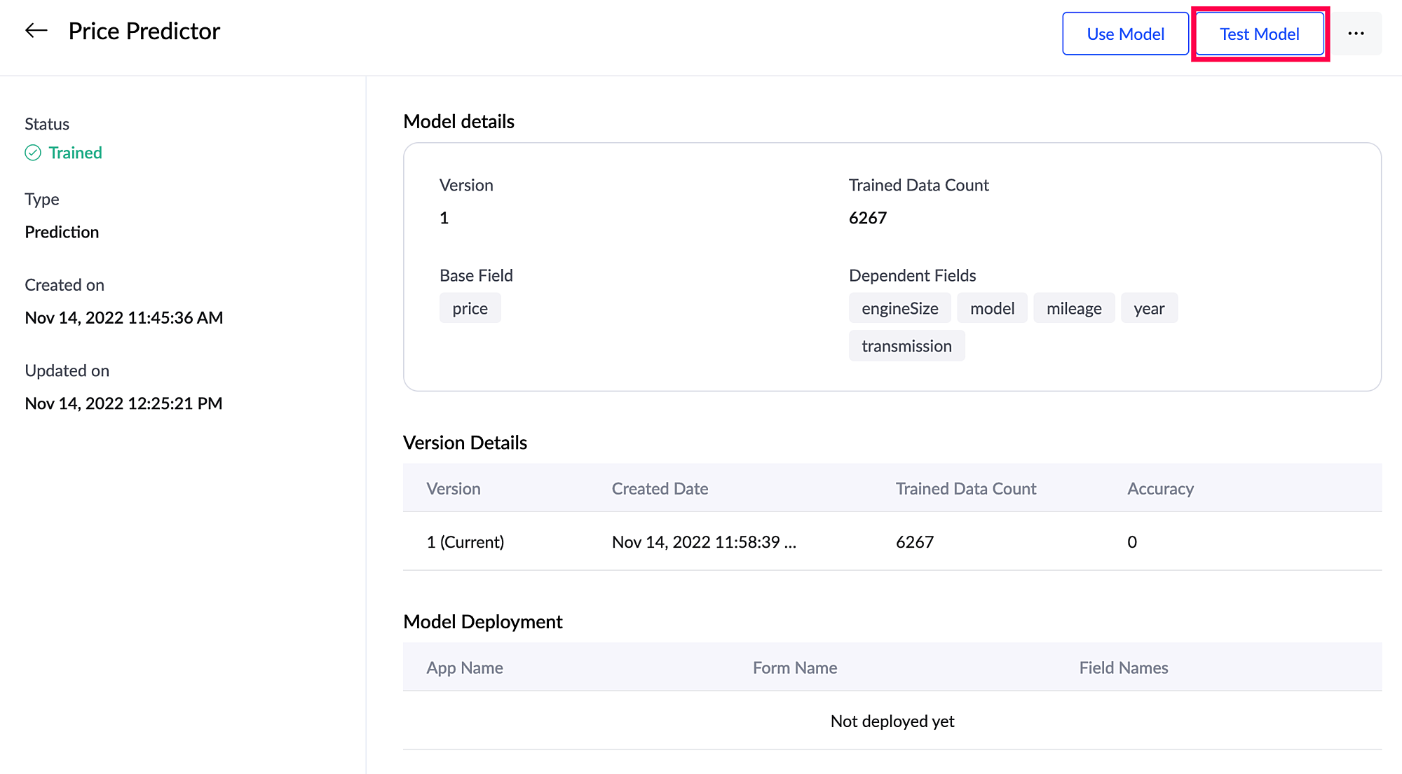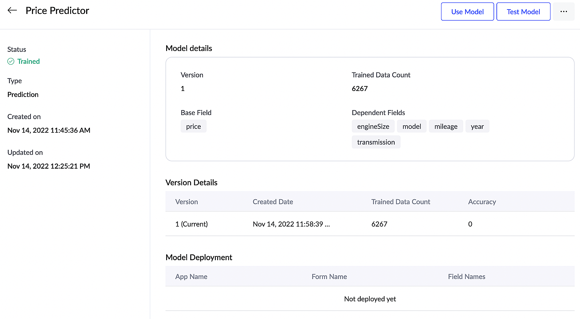 このセクションでは、モデルのバージョン数、現在稼働中のバージョン、モデル作成日、および精度スコアを確認できます。精度スコアは各学習済みバージョンごとに表示されます。モデルを再学習し、この精度スコアを使って同一モデルの2つのバージョンを素早く比較できます。