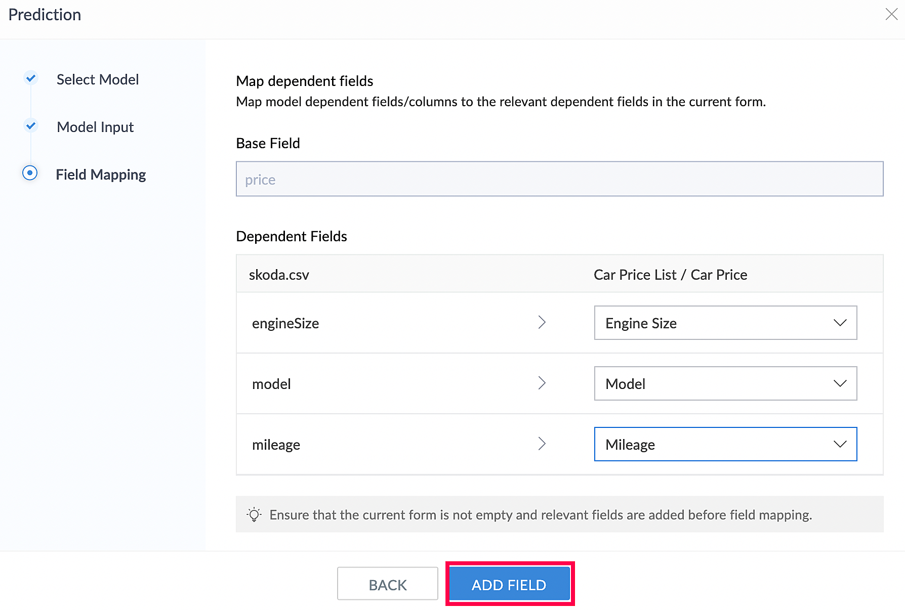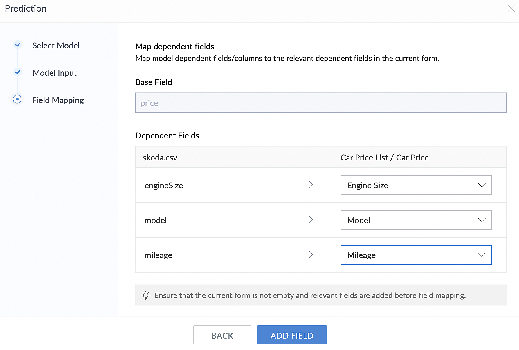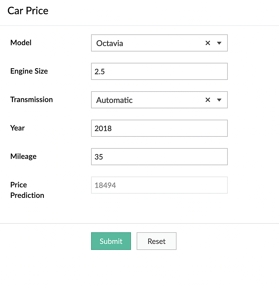 アプリを有効化し、依存項目に値を追加できるようになります。prediction 項目がそれに応じた値を予測します。