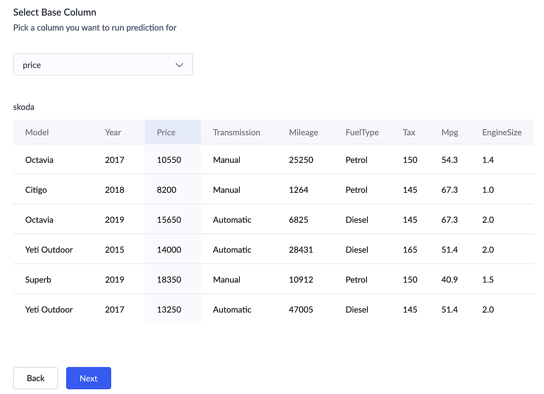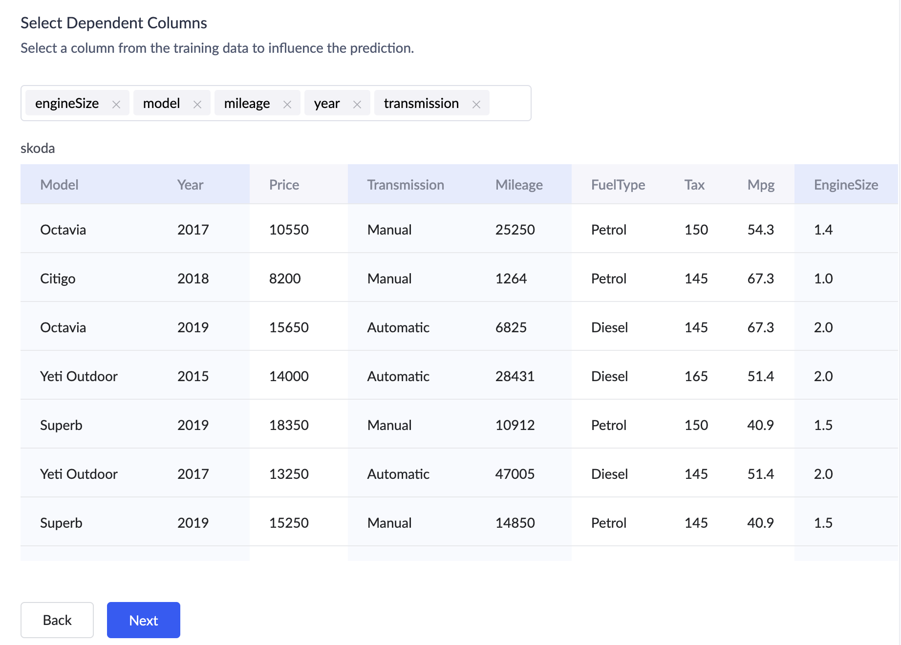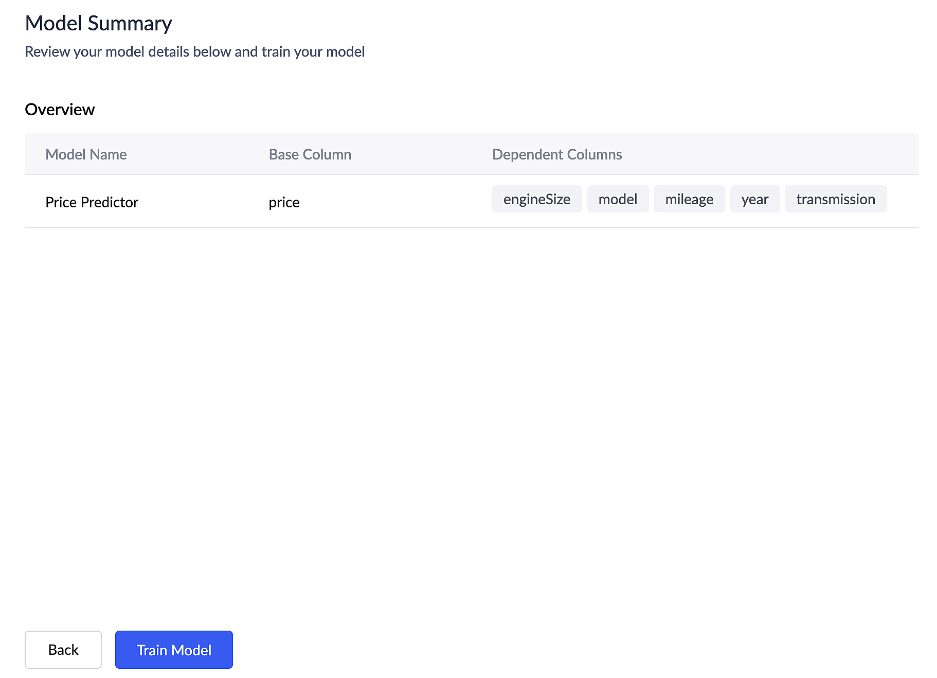 トレーニングデータを追加した後、Model 名前、Base 項目/列、依存項目/Columnsなどのmodel詳細を確認できます。修正が必要な場合は、前の画面に戻って編集してください。問題なければ、そのままモデルのトレーニングに進めます。