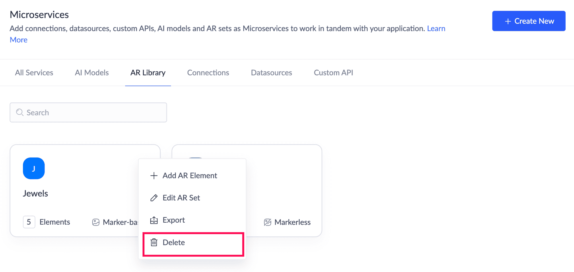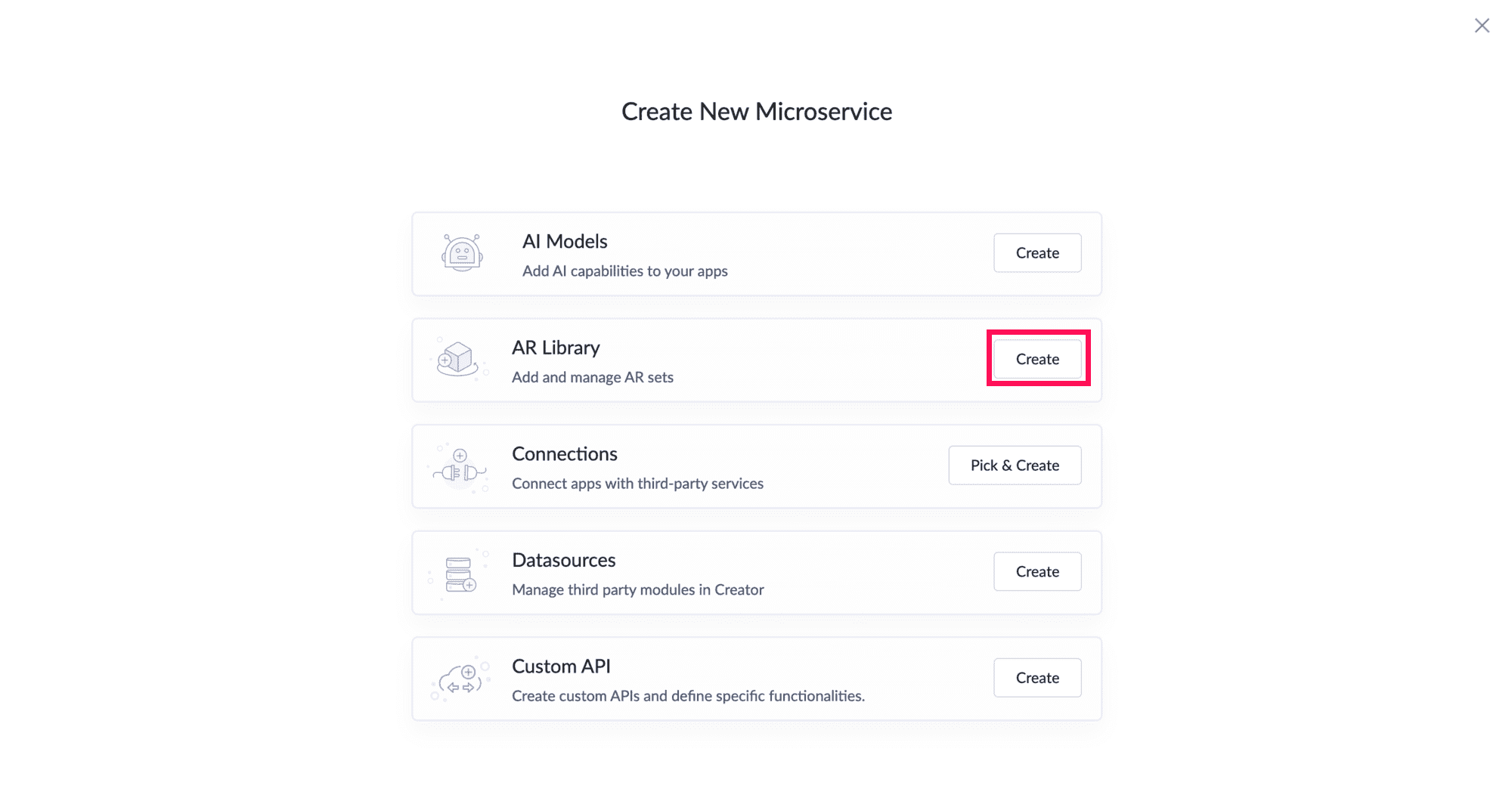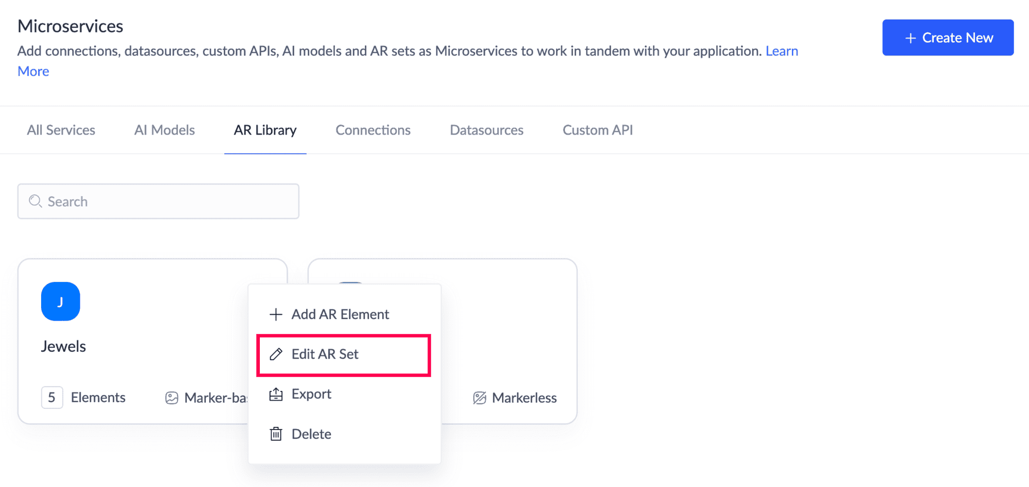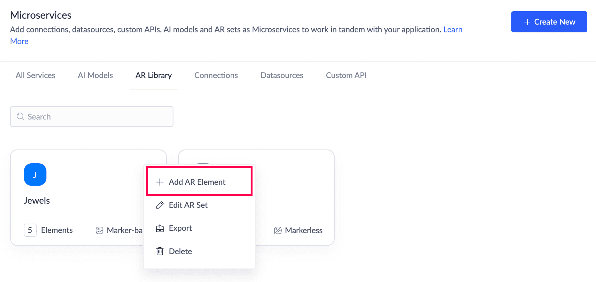 19. 既存のARセットにAR要素を追加するには、Microサービスページに移動します。