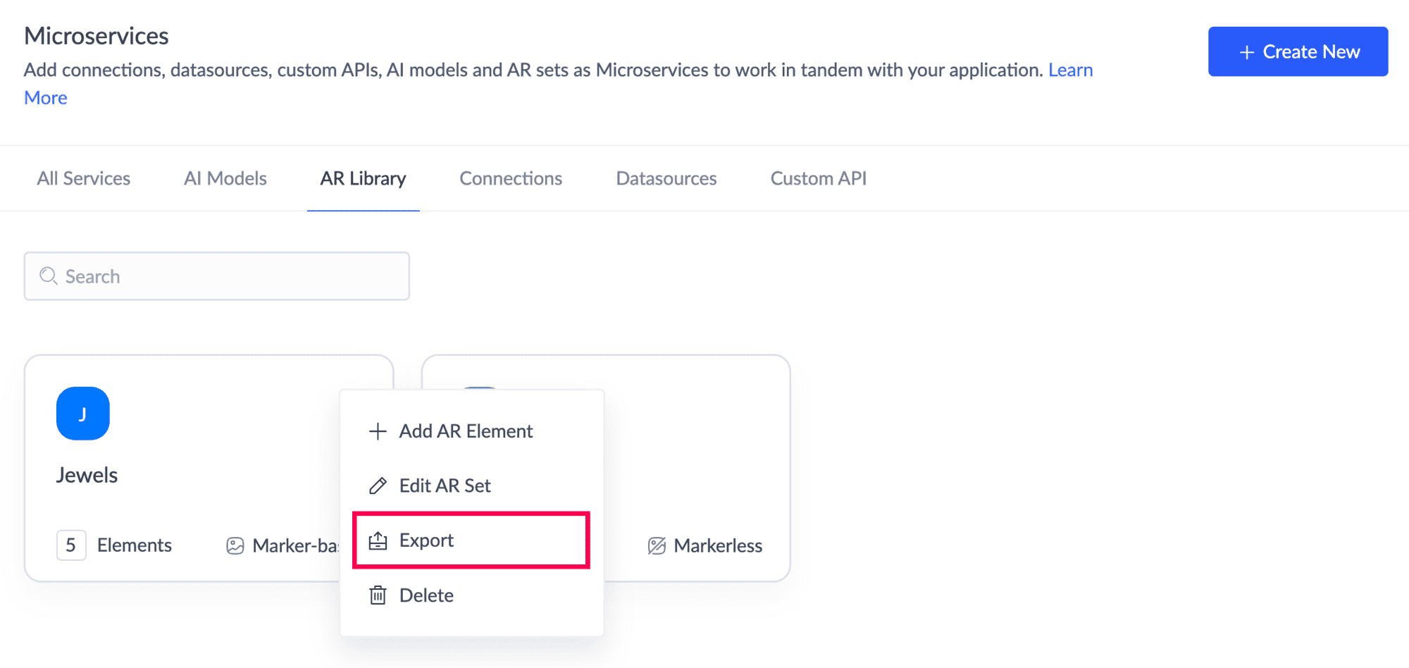 10. AR要素をエクスポートするには、現在のARセットから、必須AR要素の横にある三点リーダーアイコンをクリックし、エクスポートオプションを選択します。