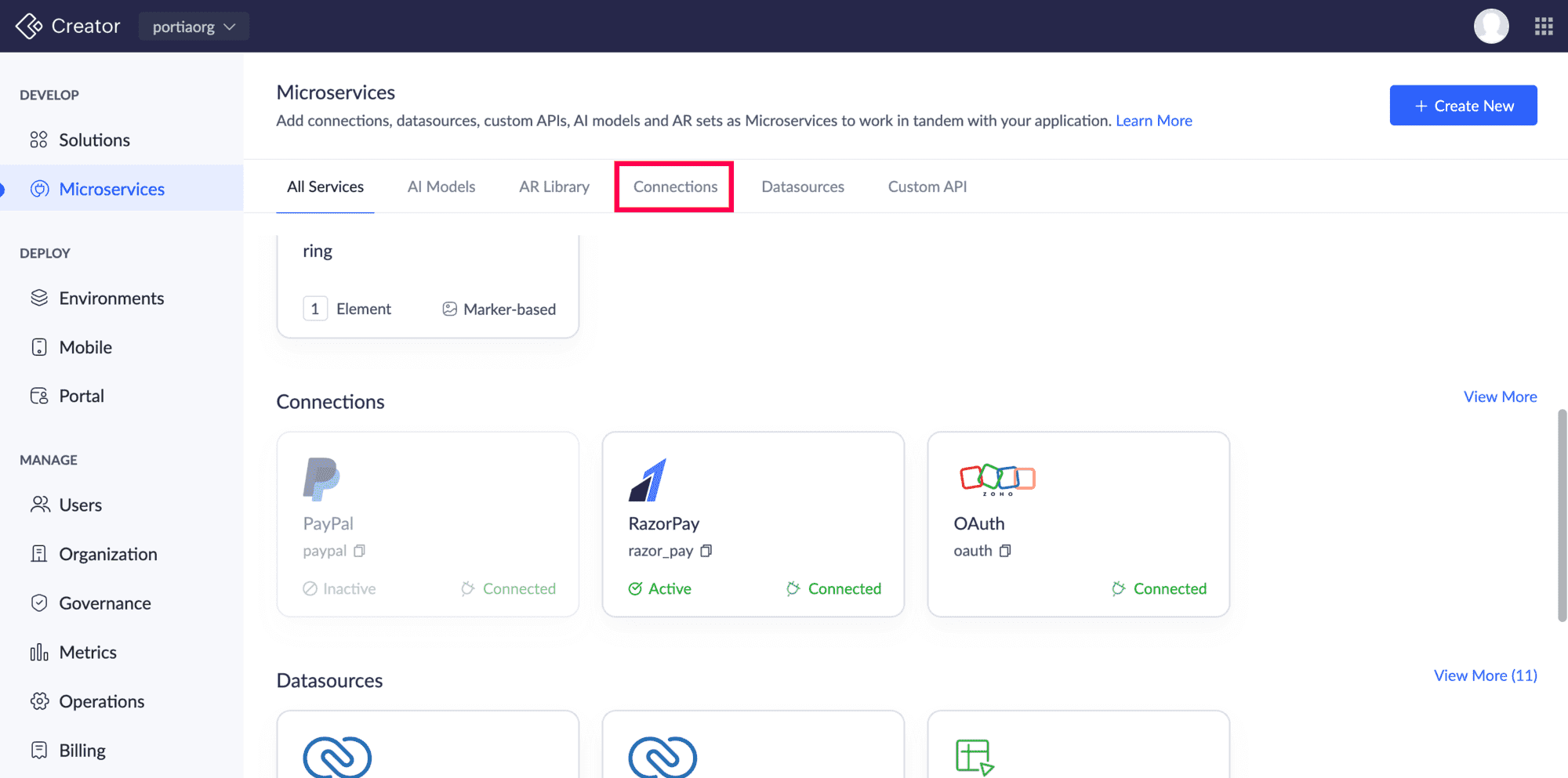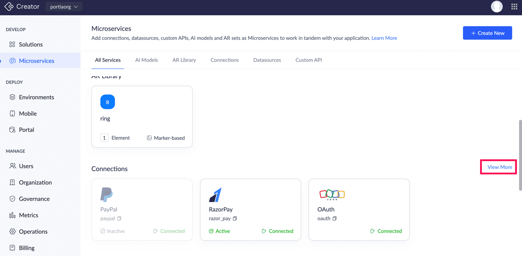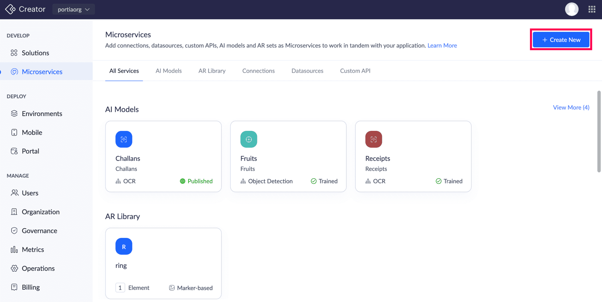 Microservices タブに移動し、右上の +新しく作成する をクリックします。