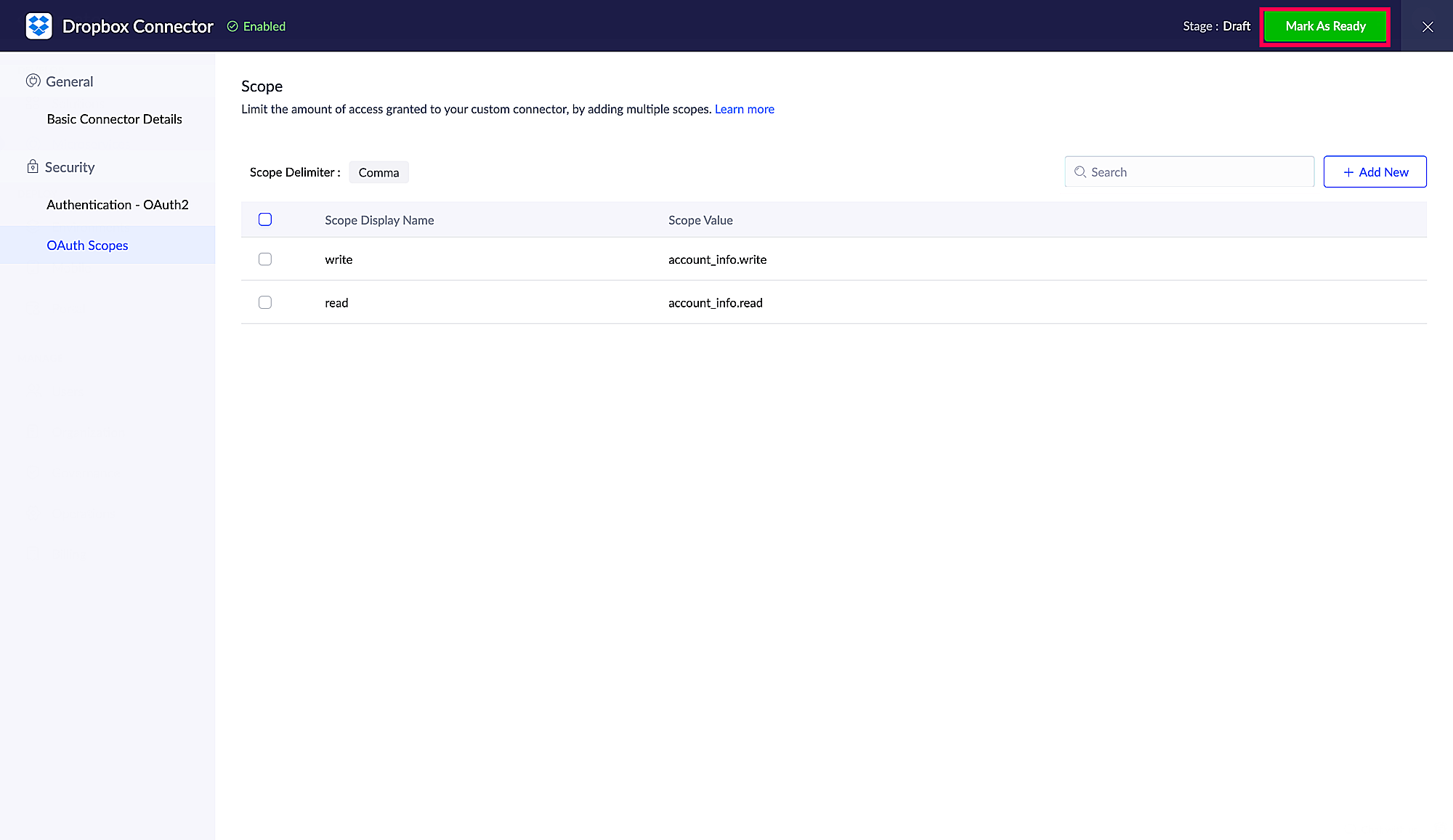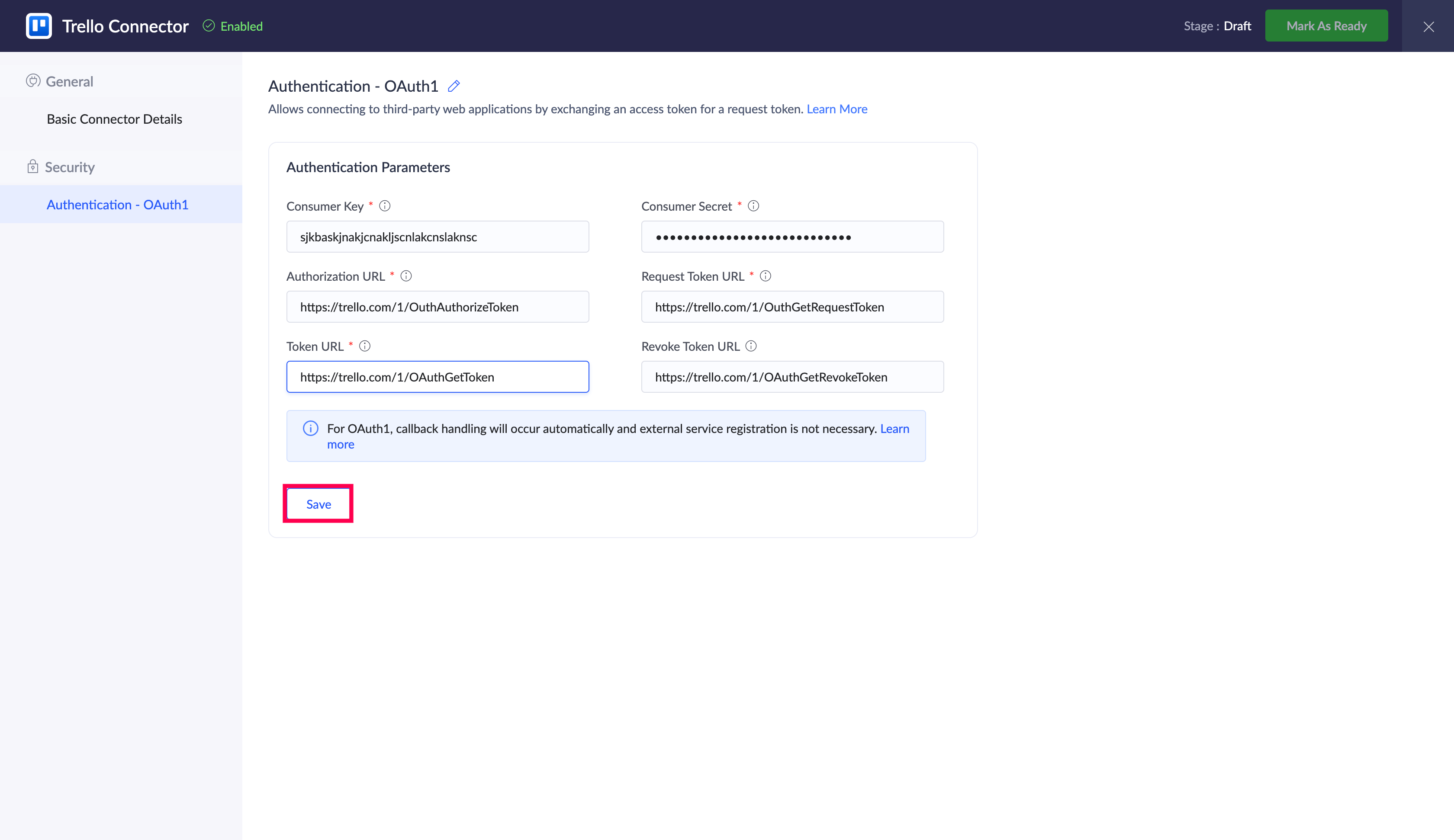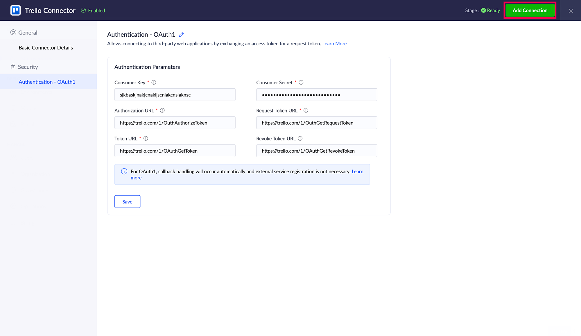 認証情報の入力が完了したら、コネクターを「Ready」に設定します。