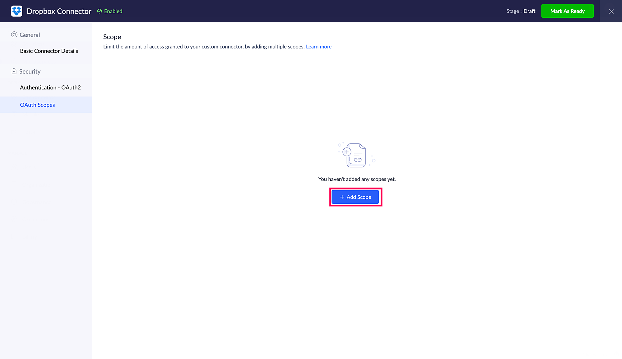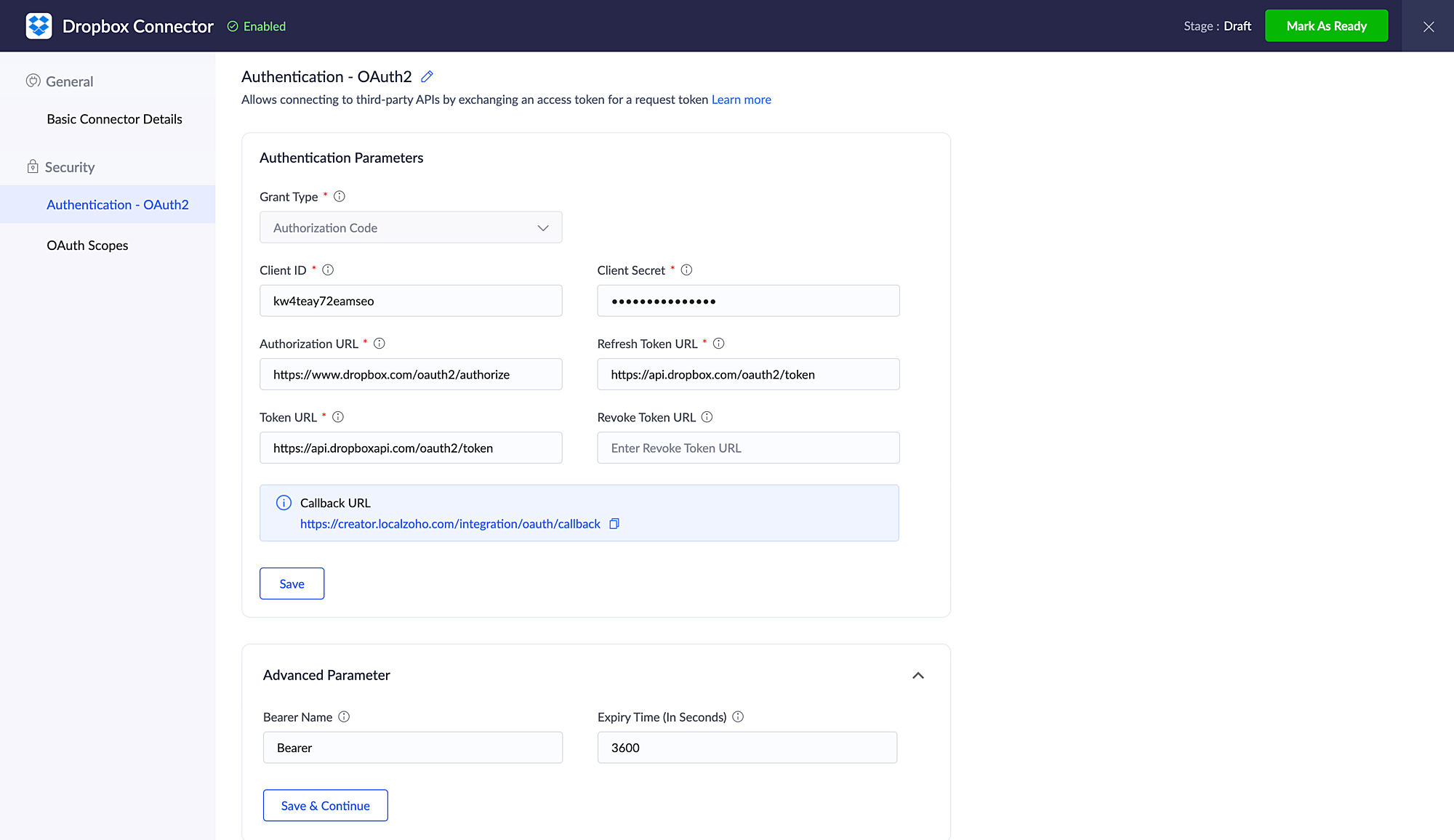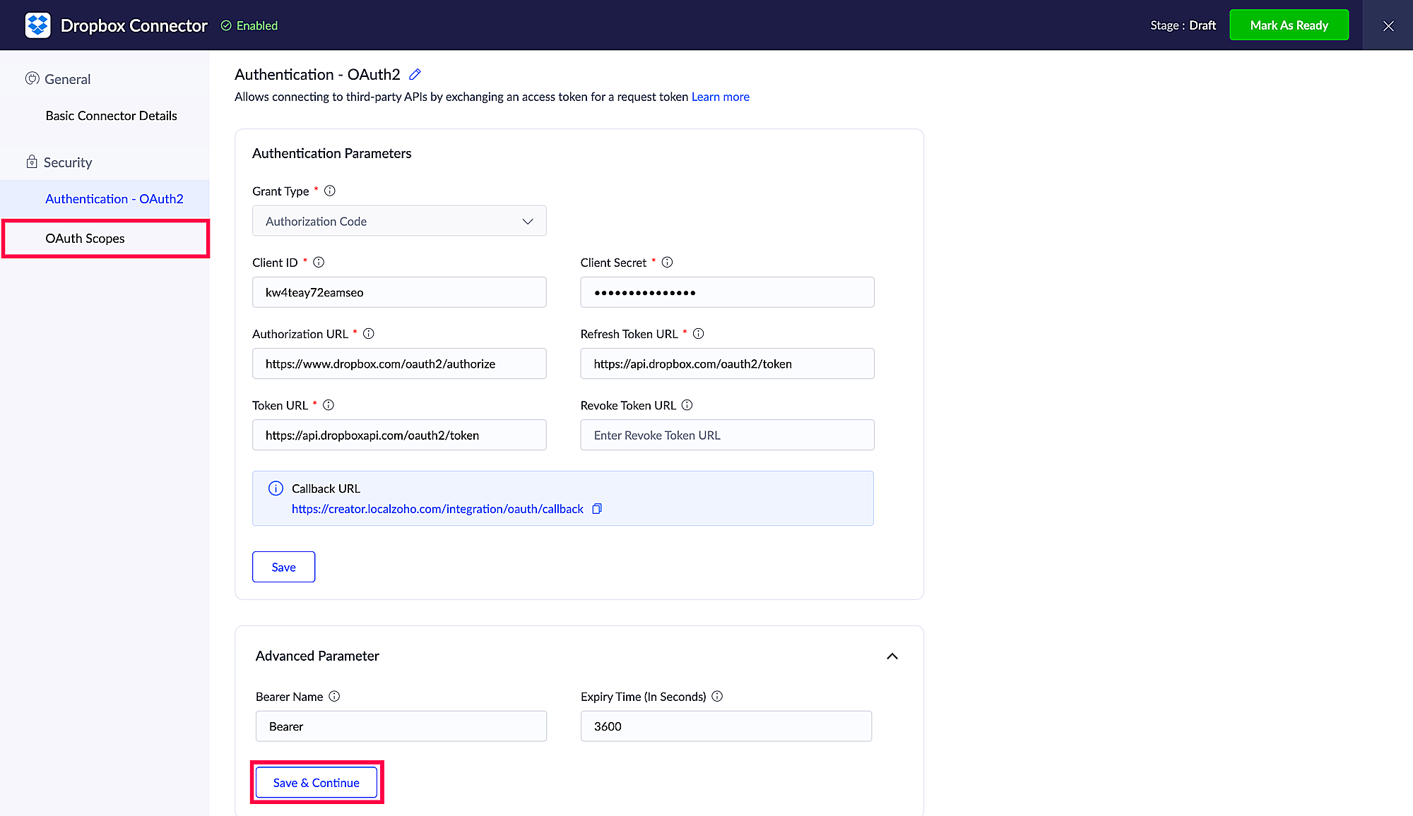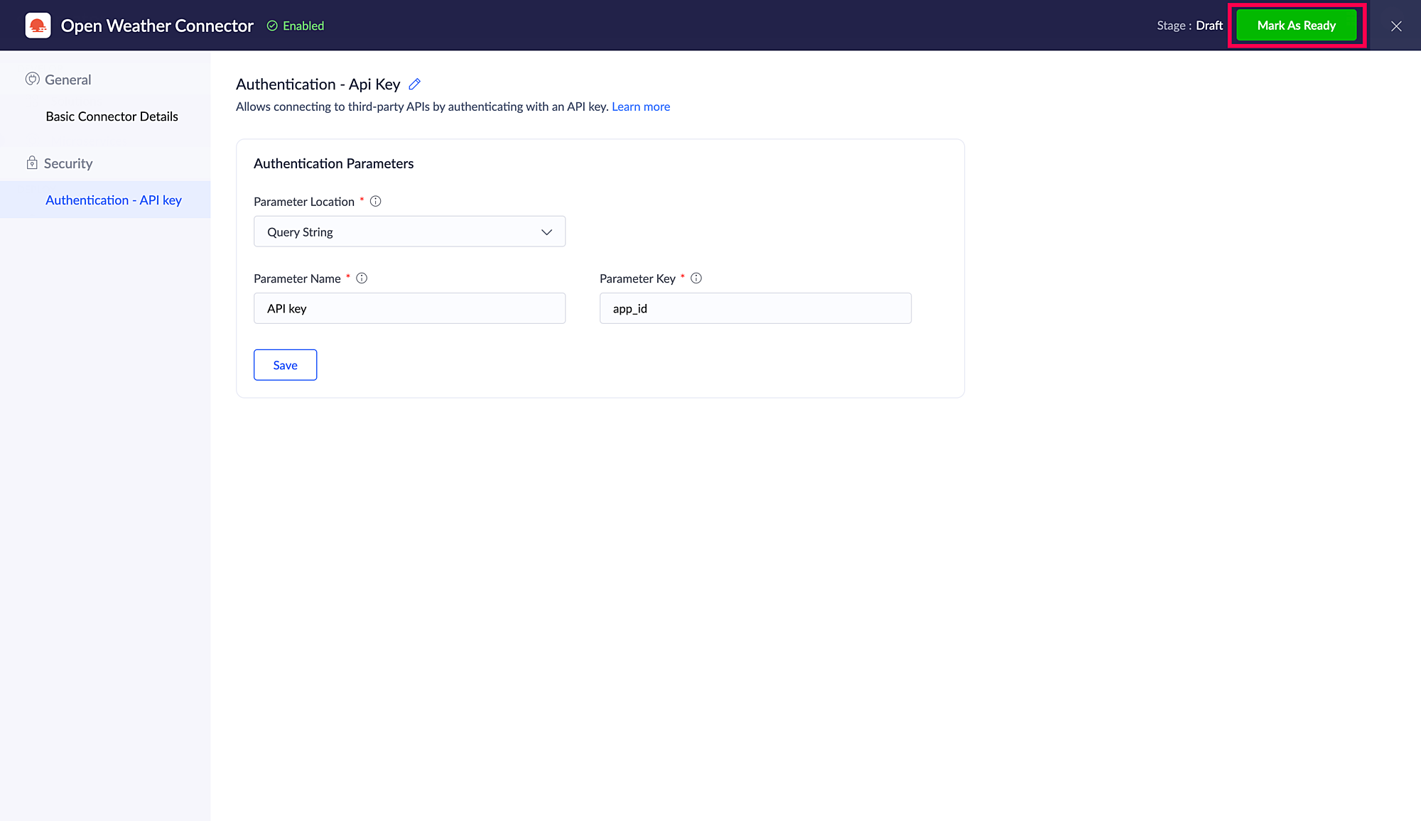 認証情報の入力が完了したら、コネクターを「Ready」に設定します。
