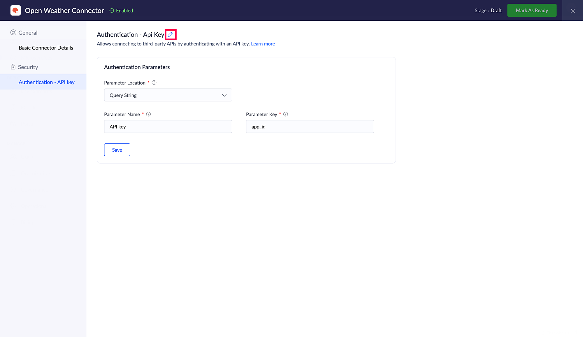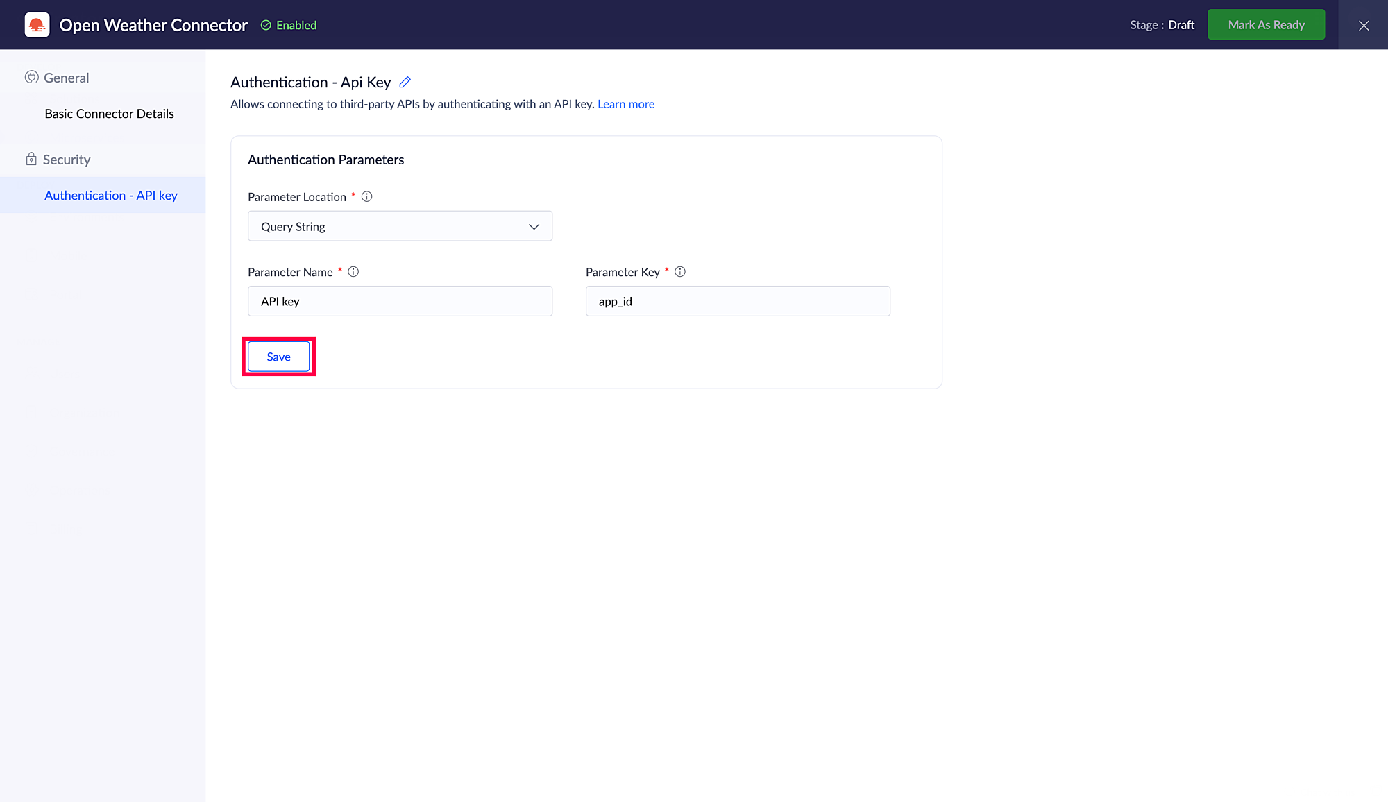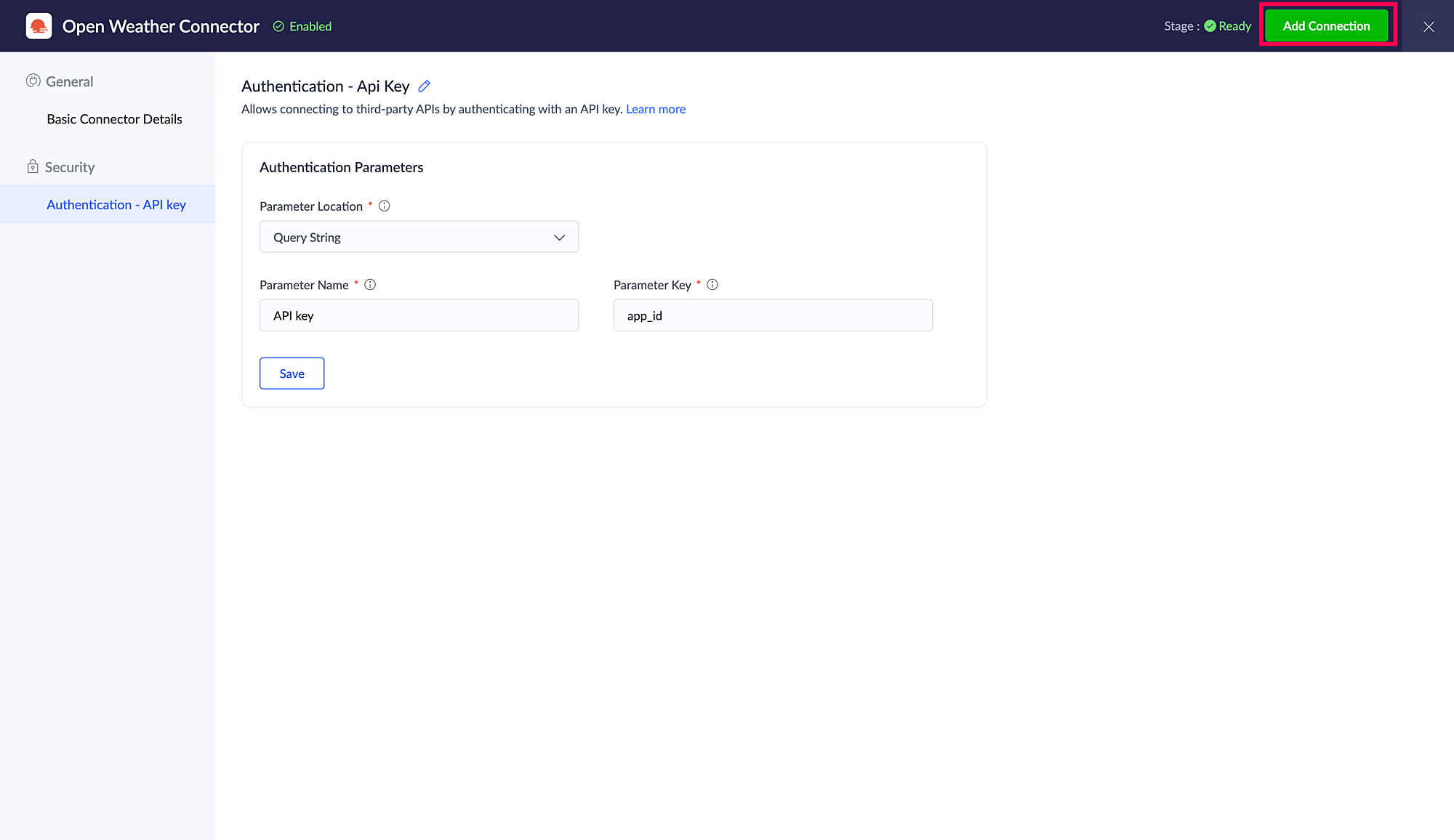 Parameter キー: 対象サービスで指定されたAPIキー API ドキュメントに記載されている、パラメーター値を送信する先を指定します。このキーは、接続の認証時に記載された Parameter 名前 としてユーザーに表示されます。