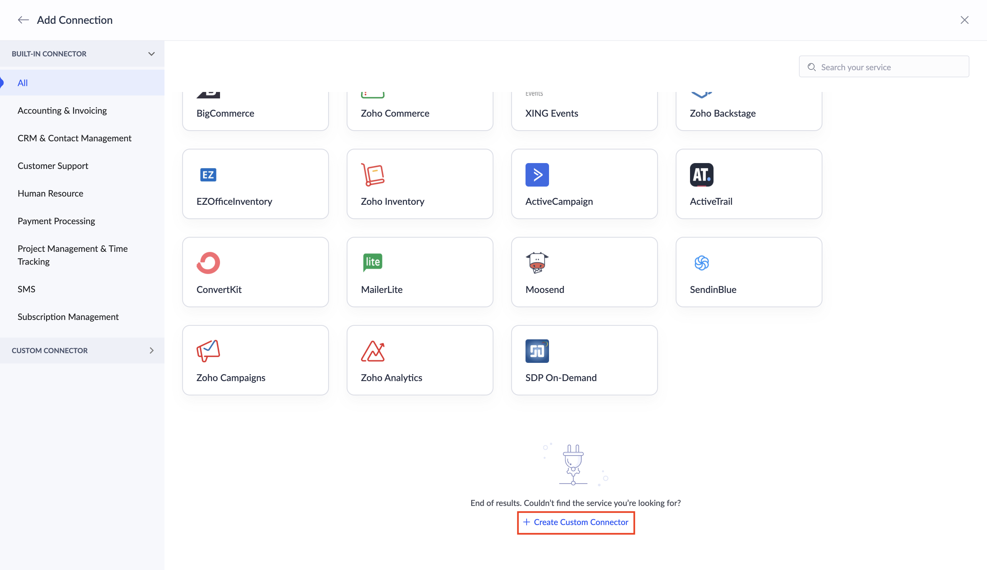 Built-in Connectors ページの一番下までスクロールし、 +作成 カスタム コネクター をクリックします。