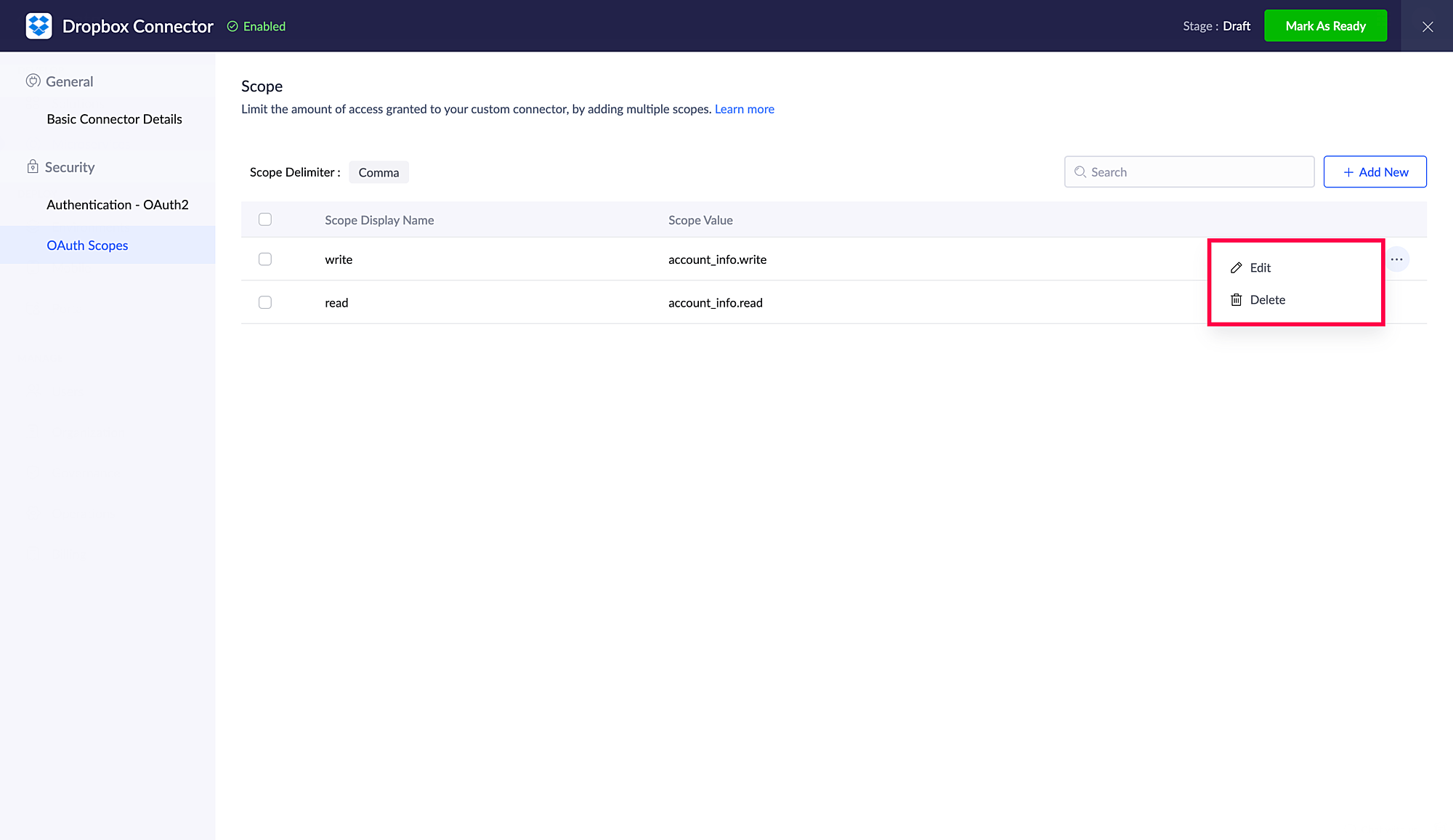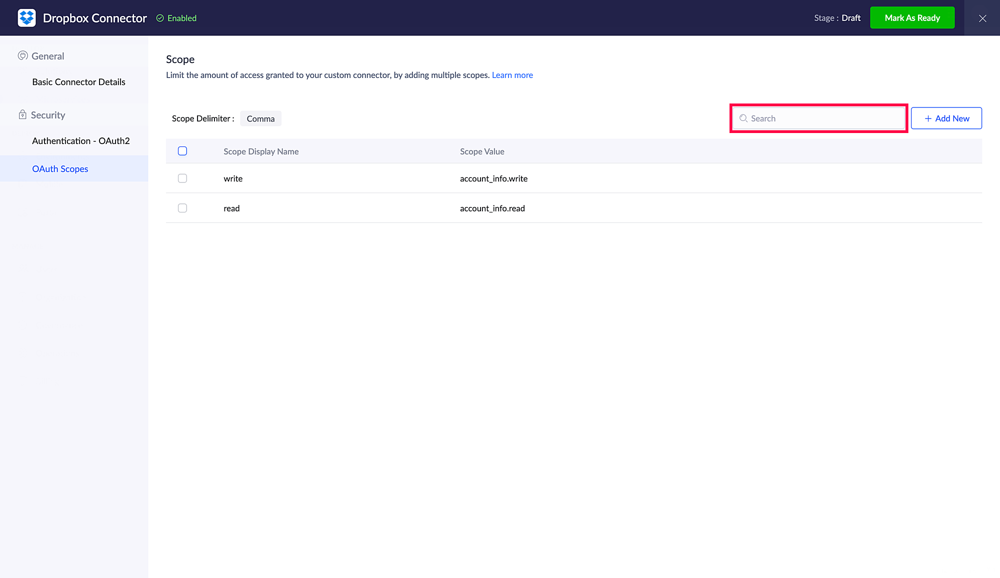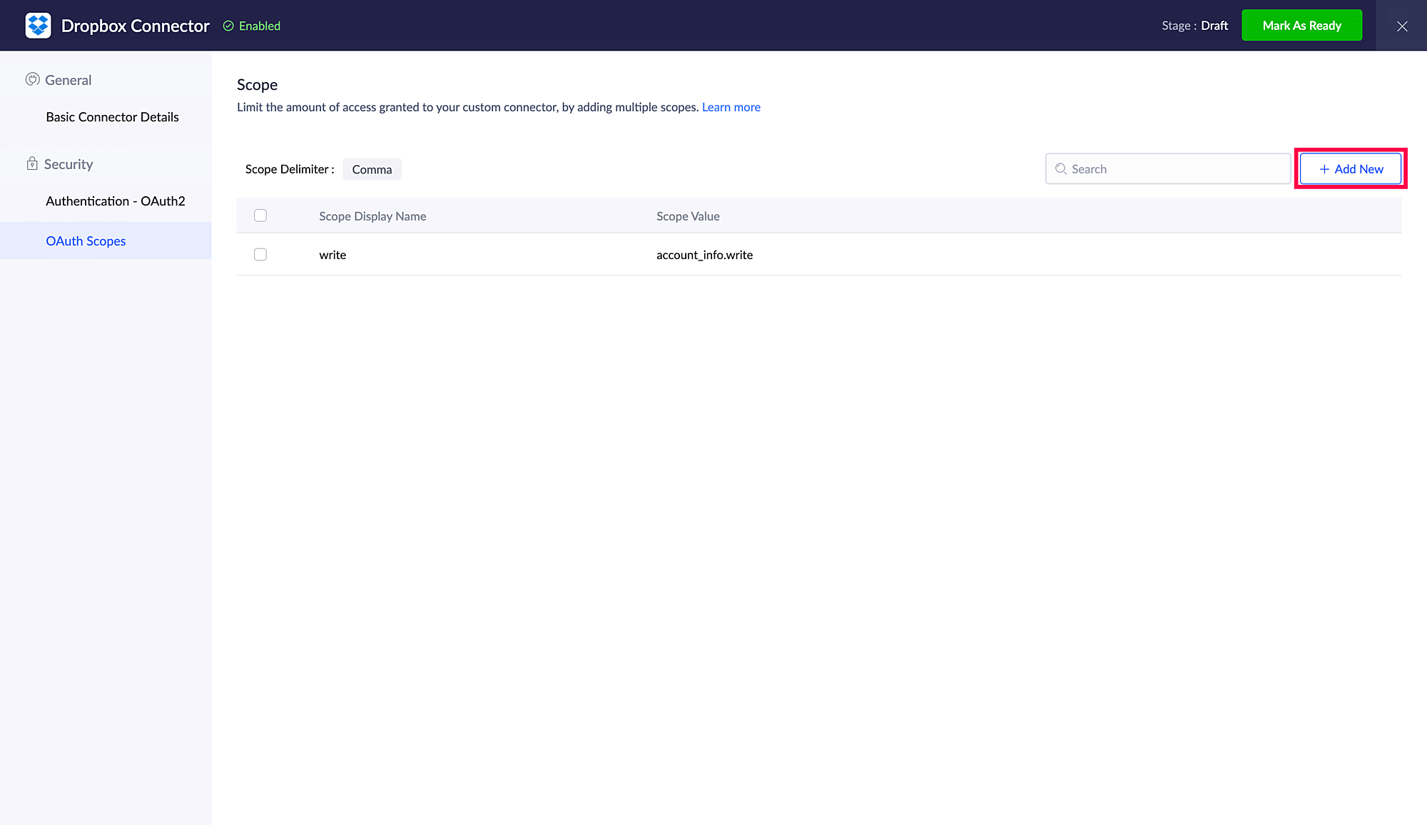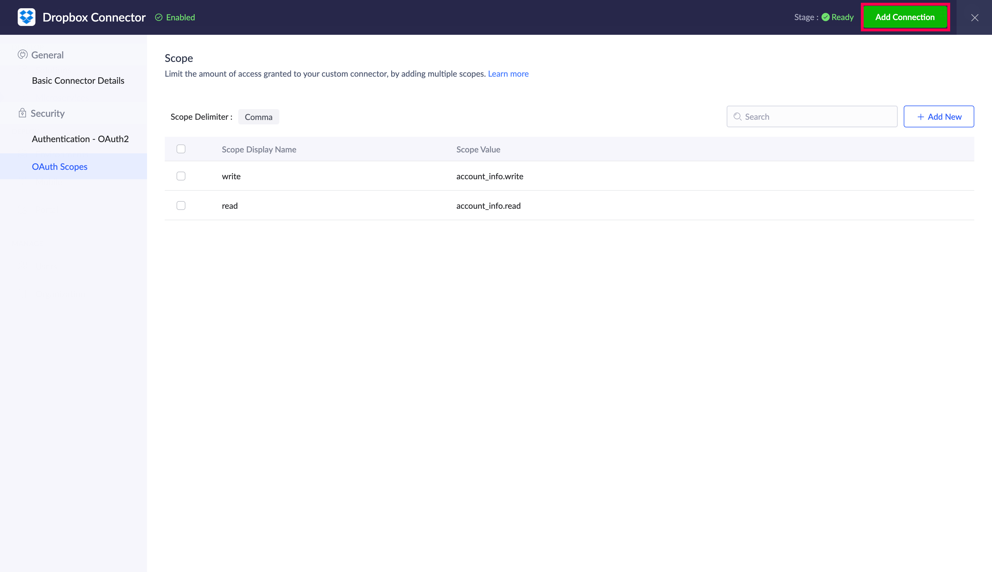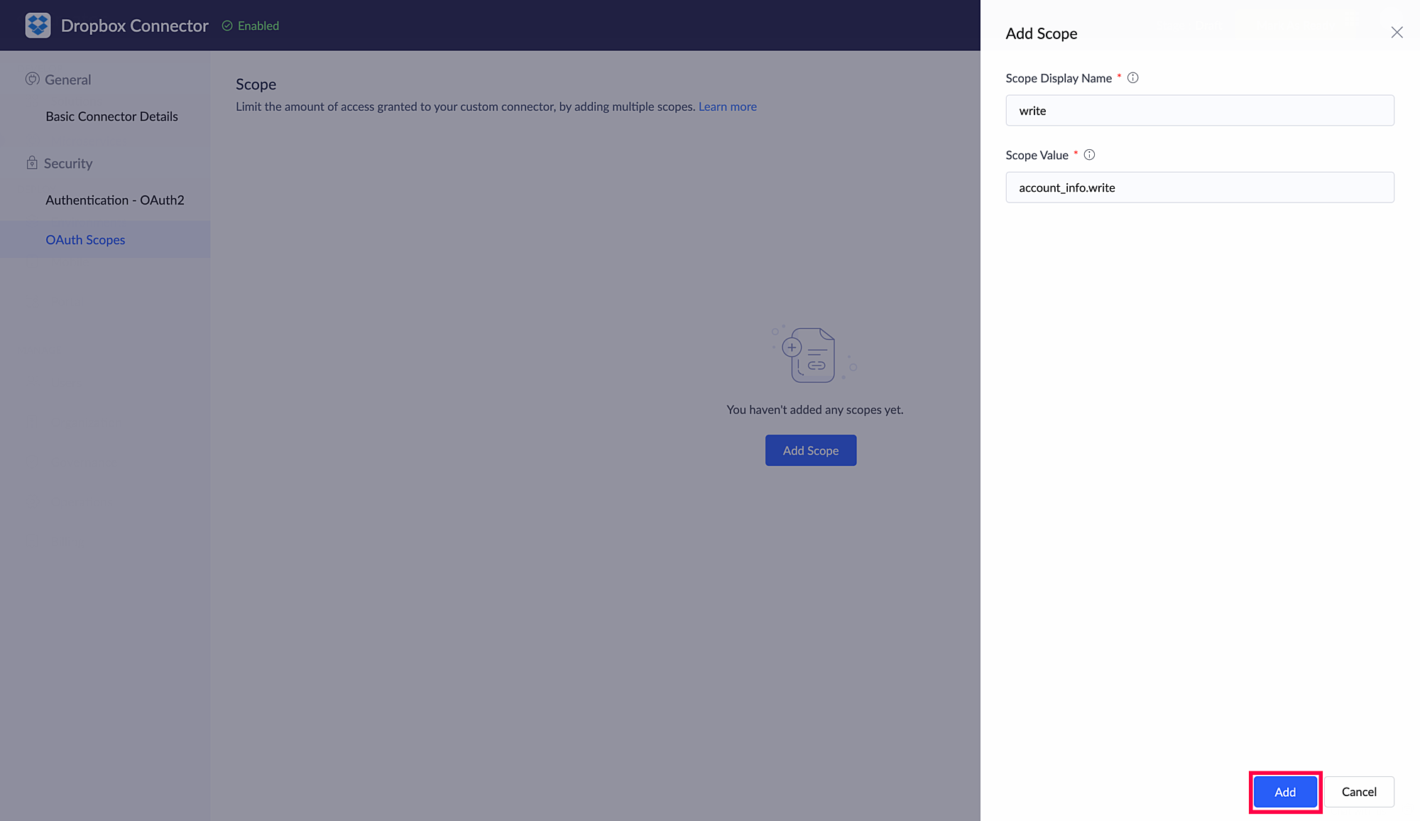 Scope 名前とScope 値を入力し、追加するをクリックします。ここでは、Dropboxのスコープを追加例としています。